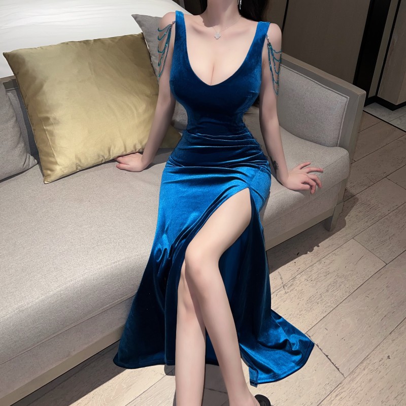 性感高档重工气质名媛丝绒开叉夜总店宴会礼服夜长裙包臀连衣裙女