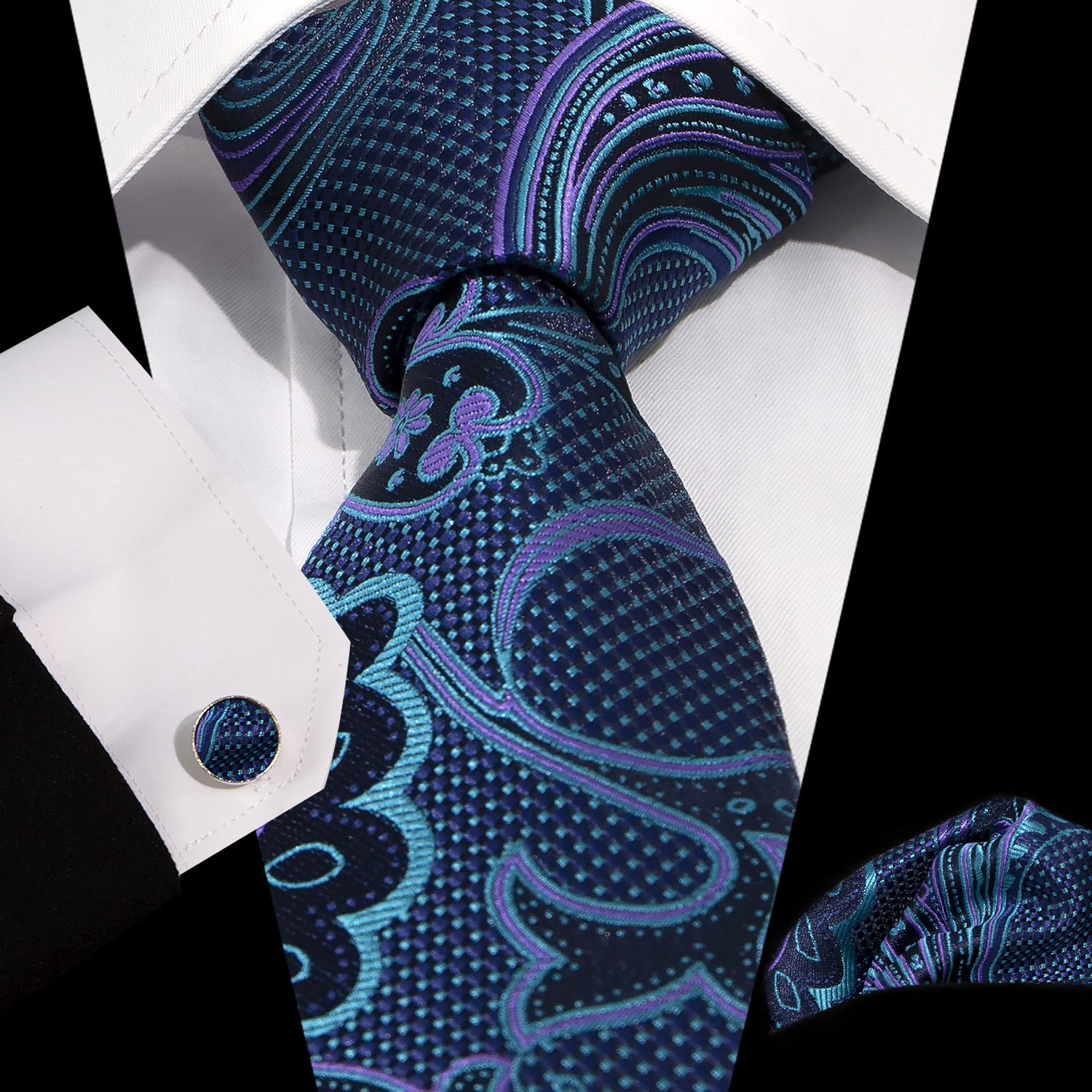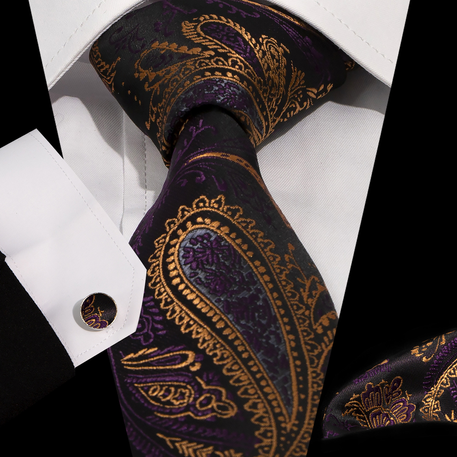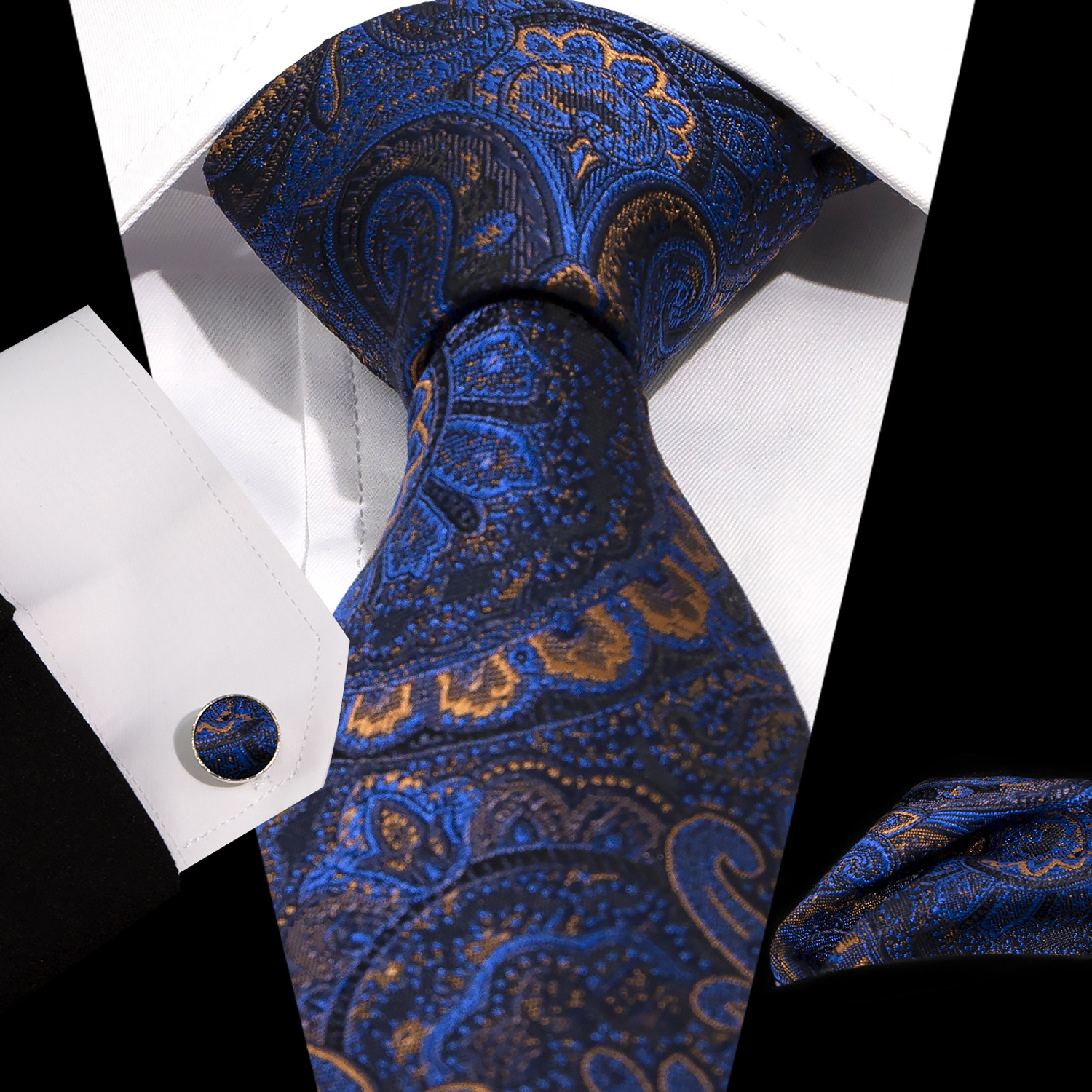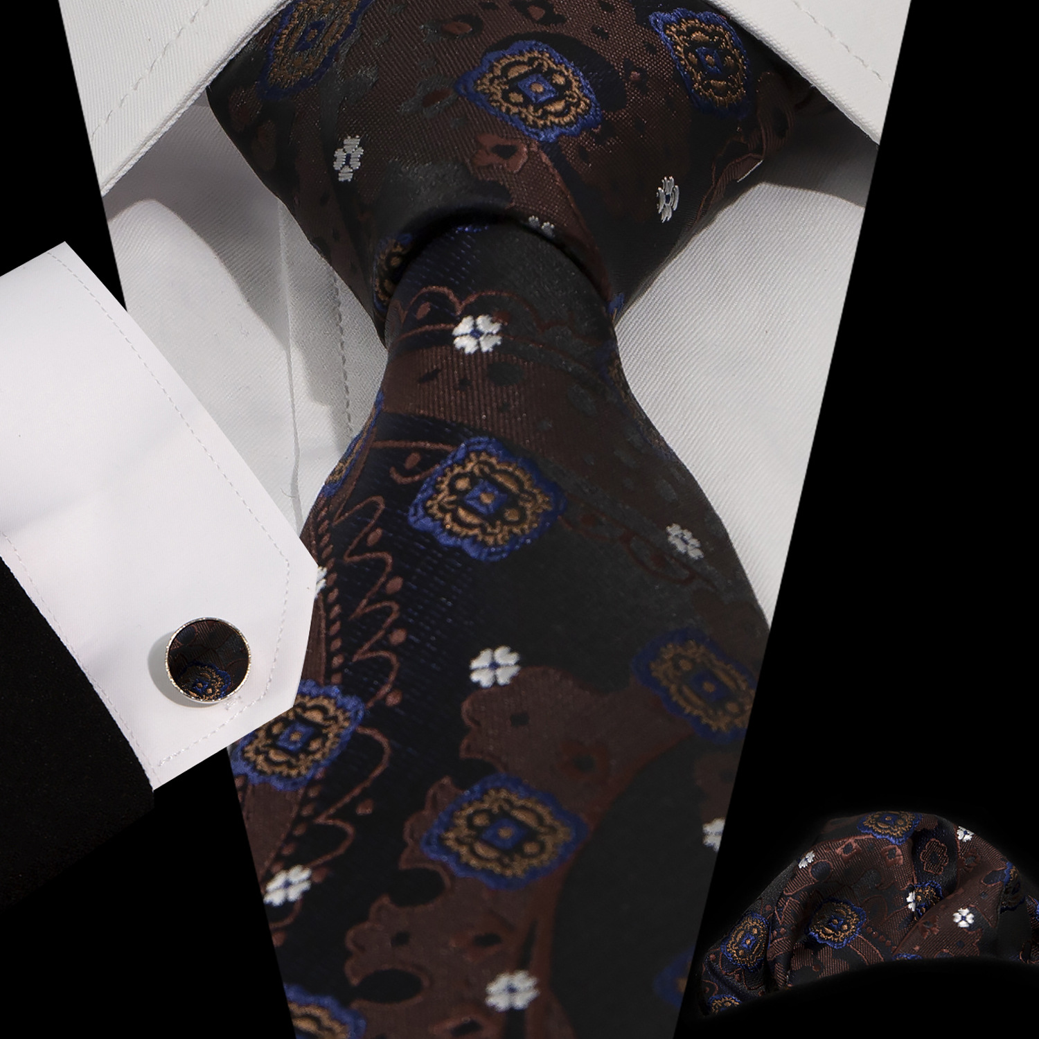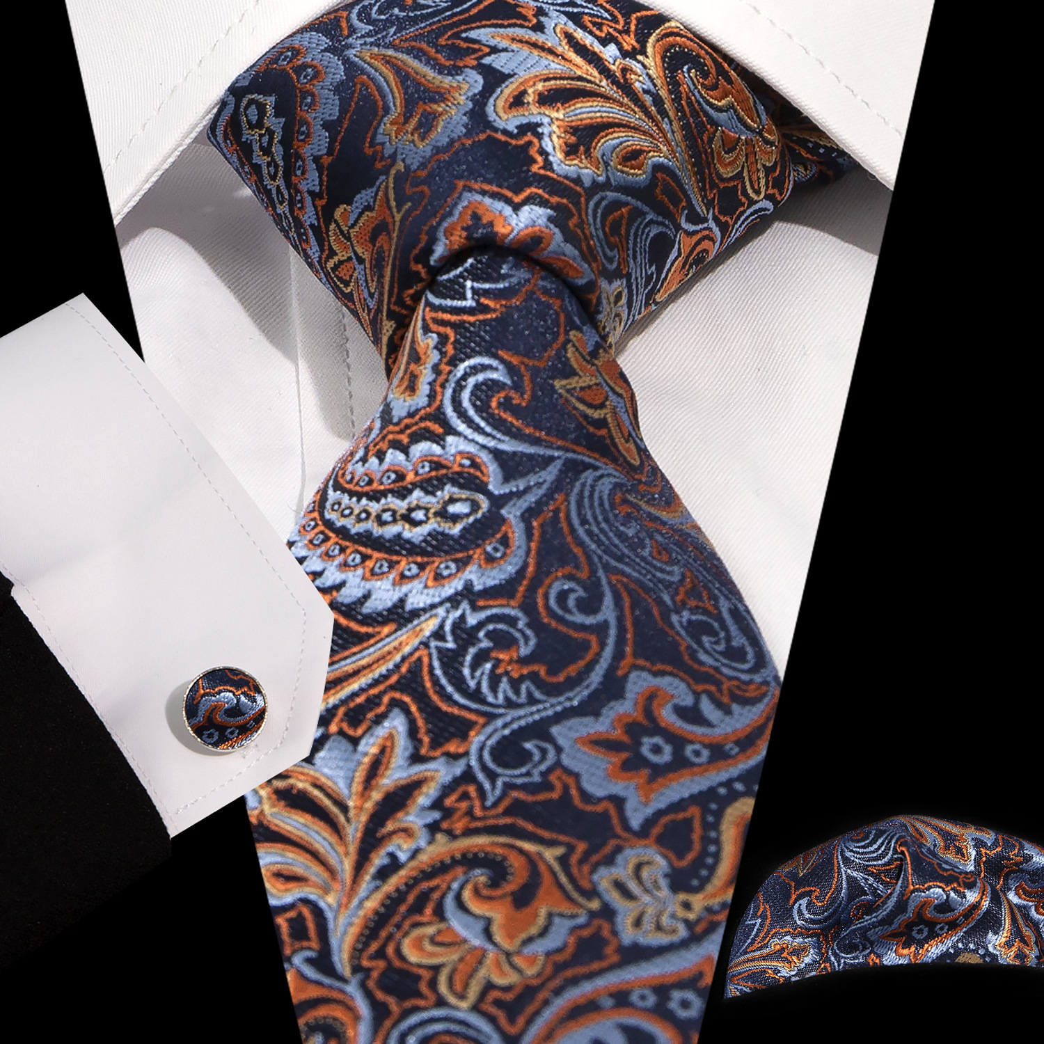 男士领带口袋巾袖扣套装 商务正装 复古8.5cm提花佩斯利领带3件套