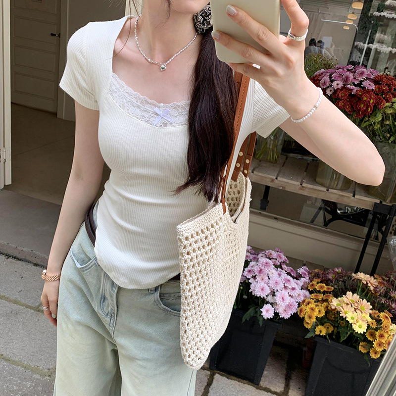 白色不规则蕾丝边修身正肩显瘦短袖T恤女夏小众独特别致纯欲上衣