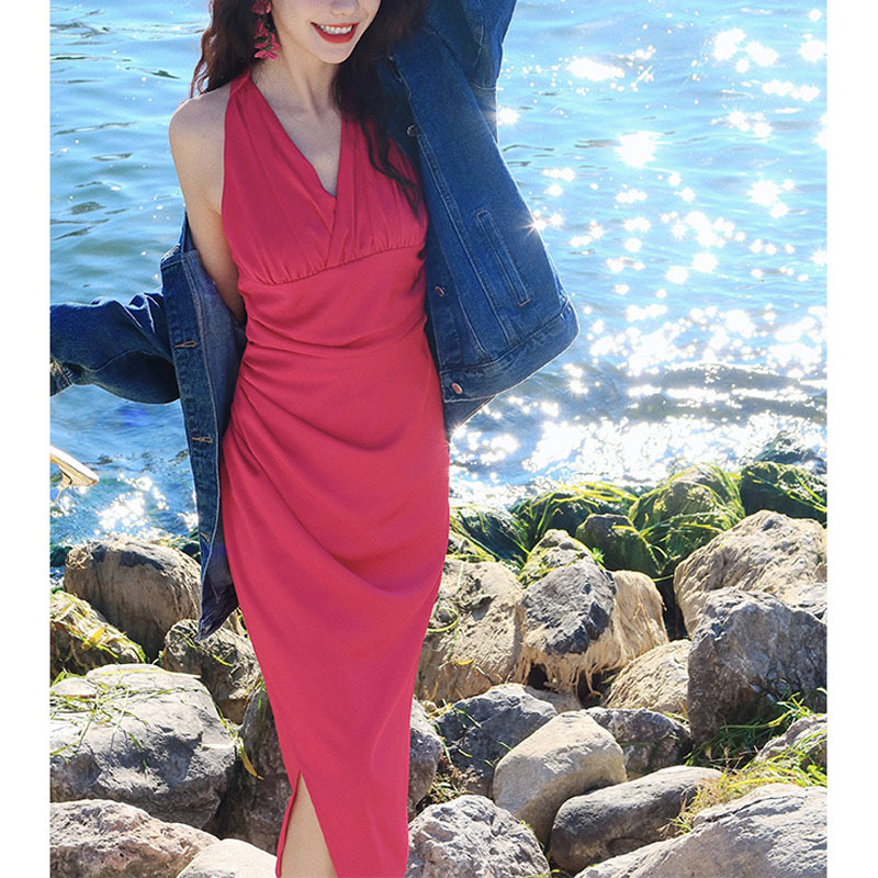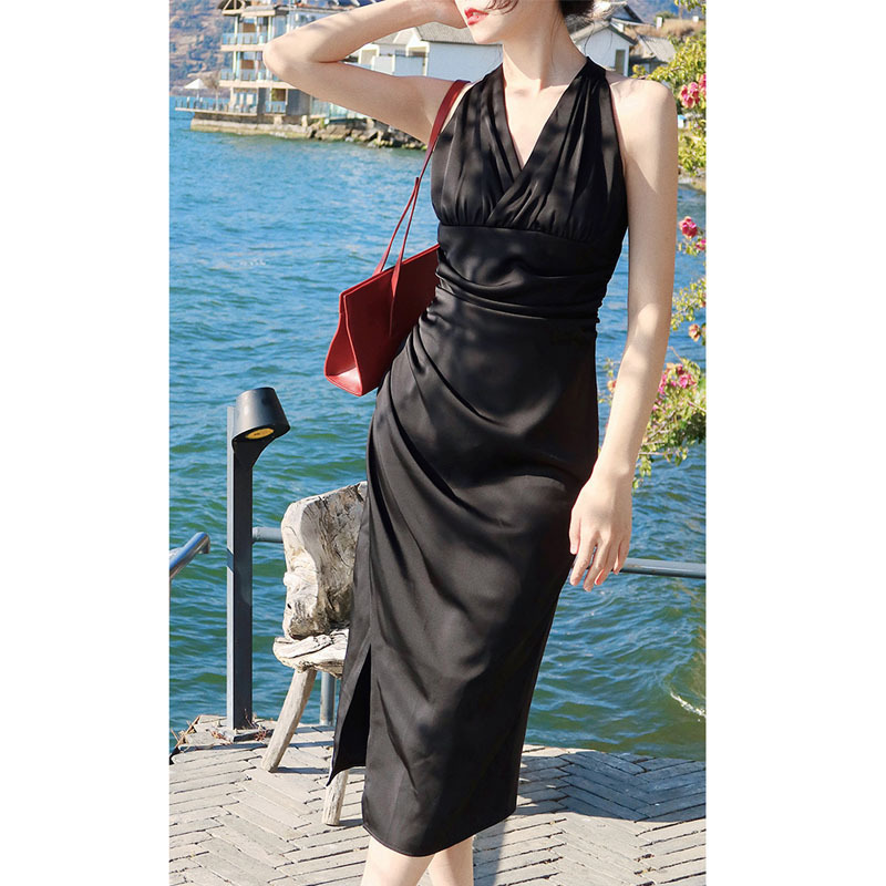 《彩色唱片》复古港风chic挂脖连衣裙女v领无袖显瘦裙子