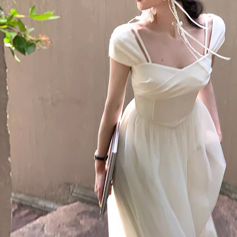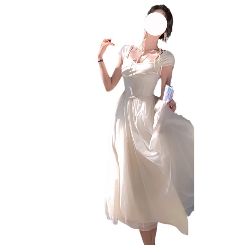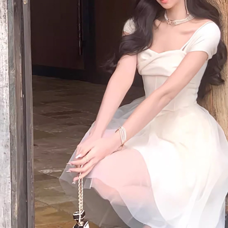 白日演奏家 法师复古温柔长短款拼接网纱一字领连衣裙年夏季