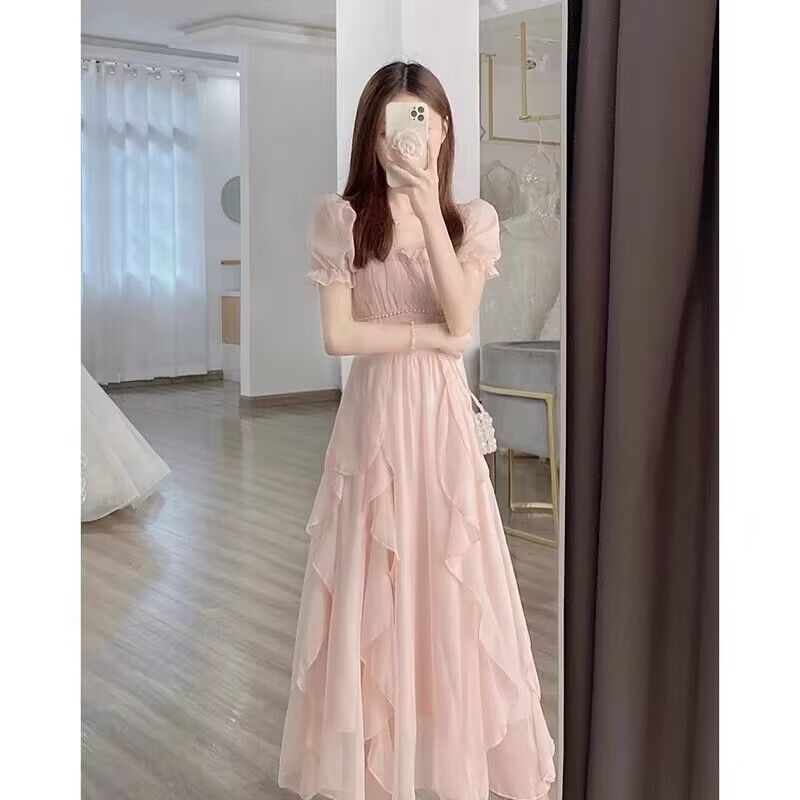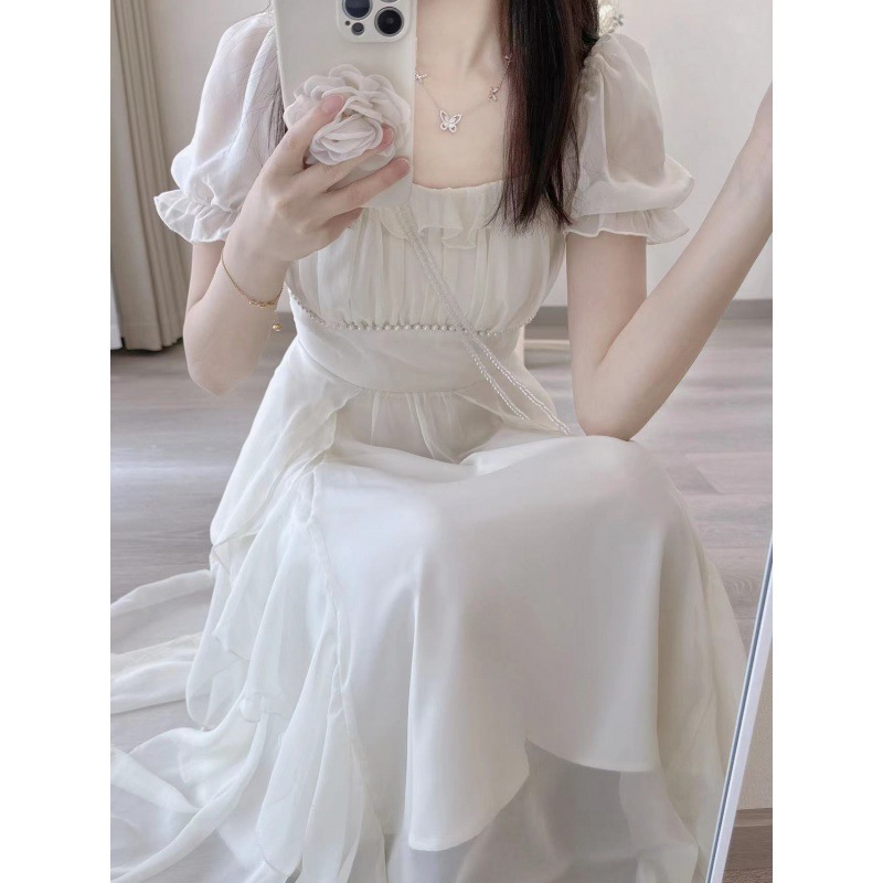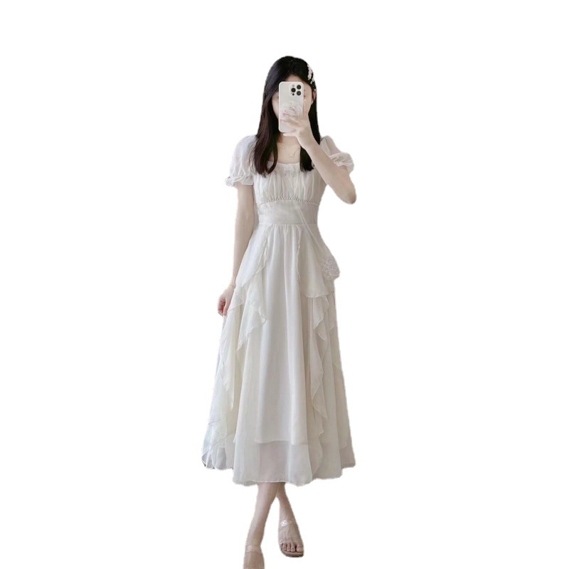 法式小众假期旅游出逃仙女小白裙夏季新款V领褶皱连衣裙女