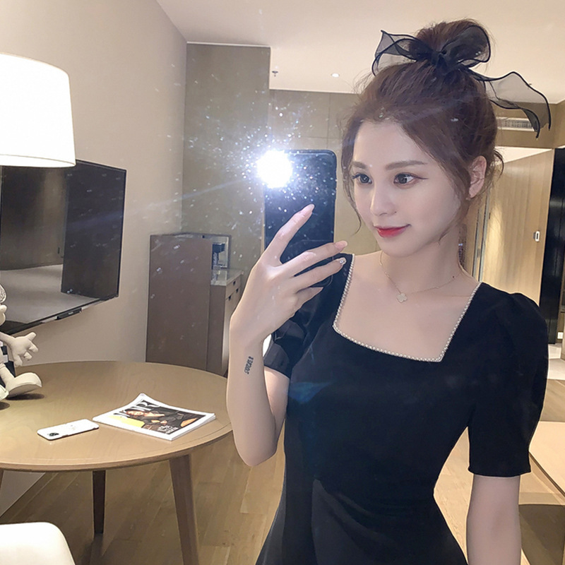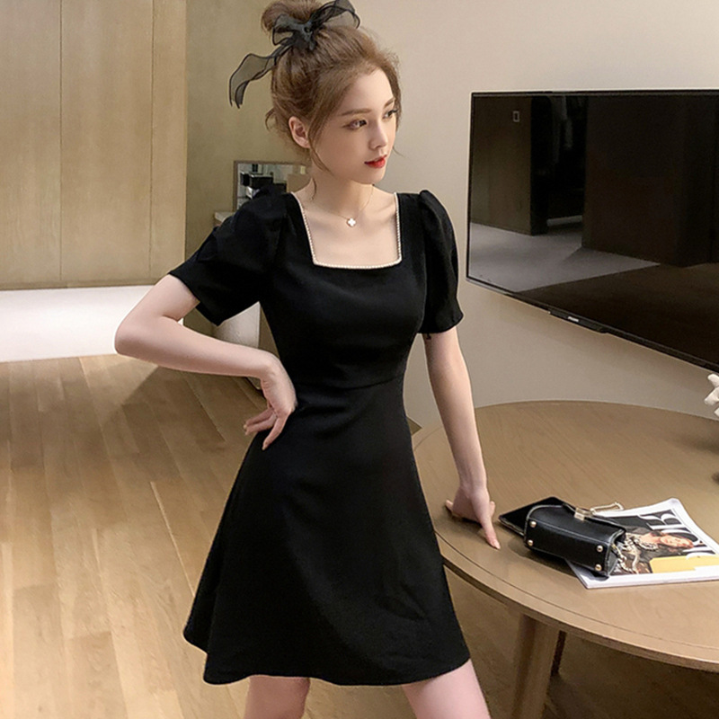 夏季新款女装小个子赫本风小黑裙法式复古显瘦方领黑色连衣裙