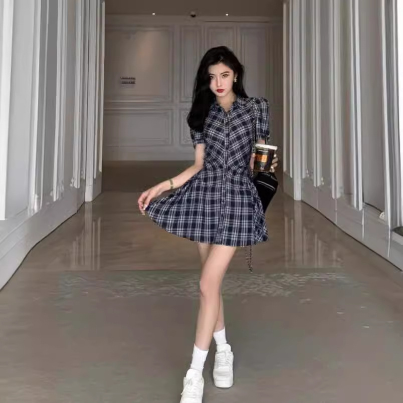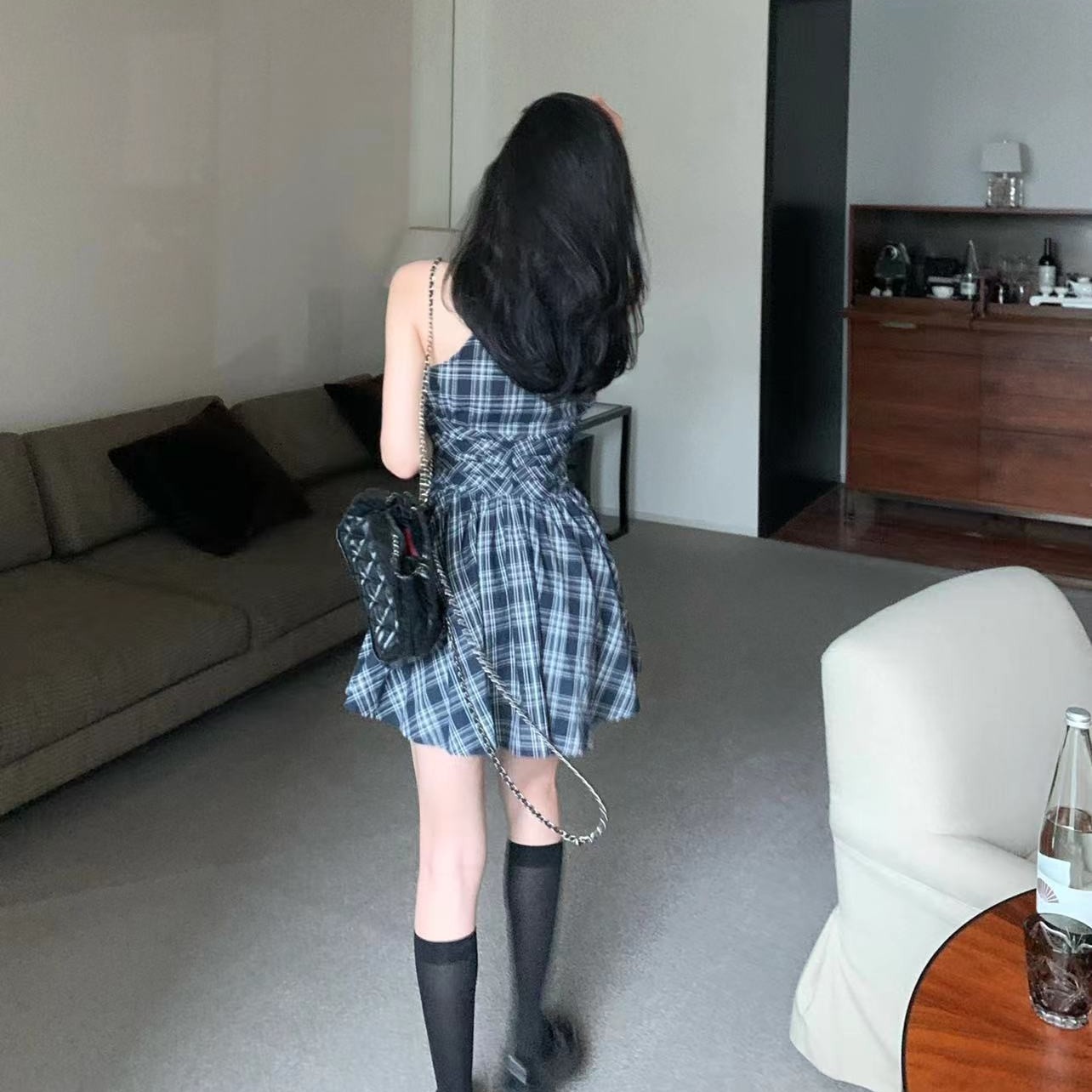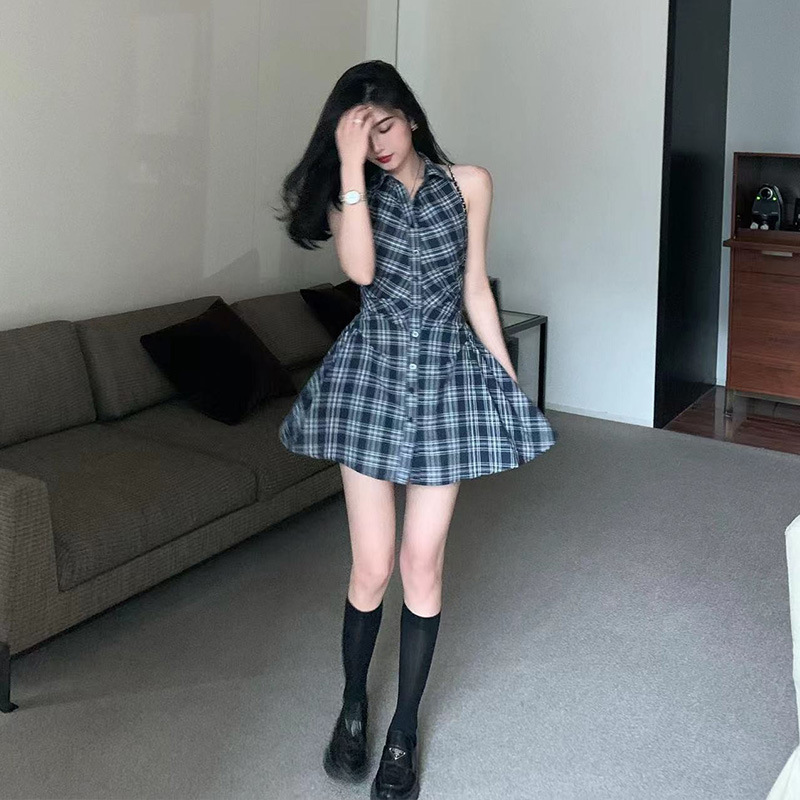 复古格纹无袖连衣裙女夏季新款收腰显瘦性感欲风背心衬衫裙
