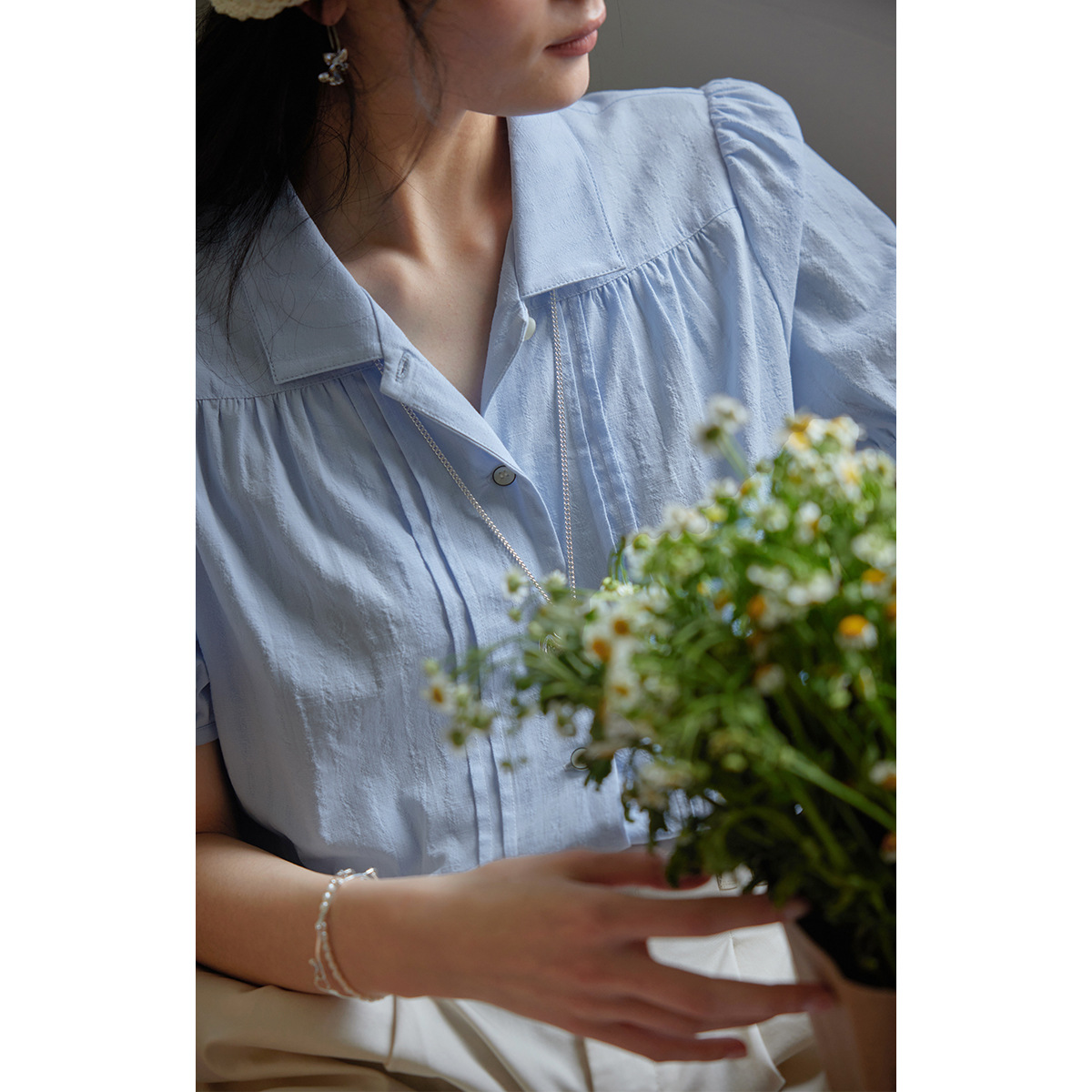 solighter 法式蓝色泡泡袖衬衫女夏季2025新款宽松翻领短袖上衣