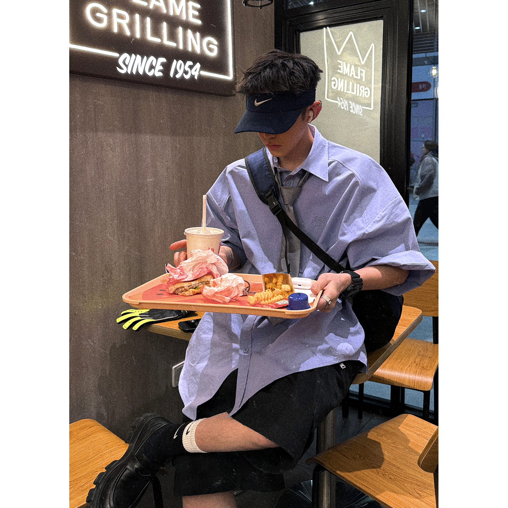 松弛少年感复古学院风刺绣短袖衬衫男夏季新款宽肩廓形大衬衣外套