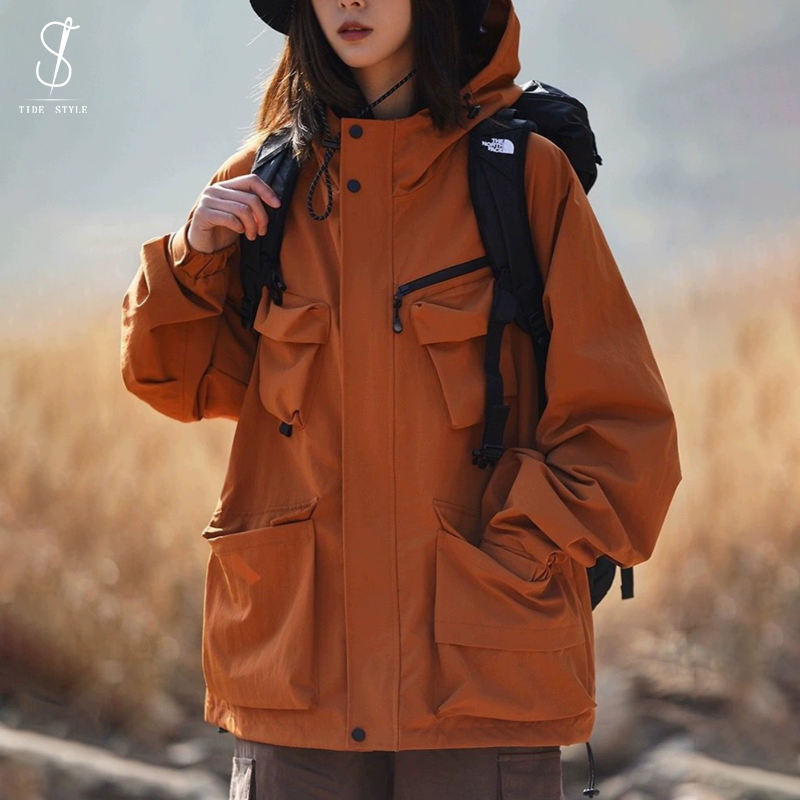 机能户外纯色多口袋工装冲锋衣男女防风防水宽松连帽夹克外套
