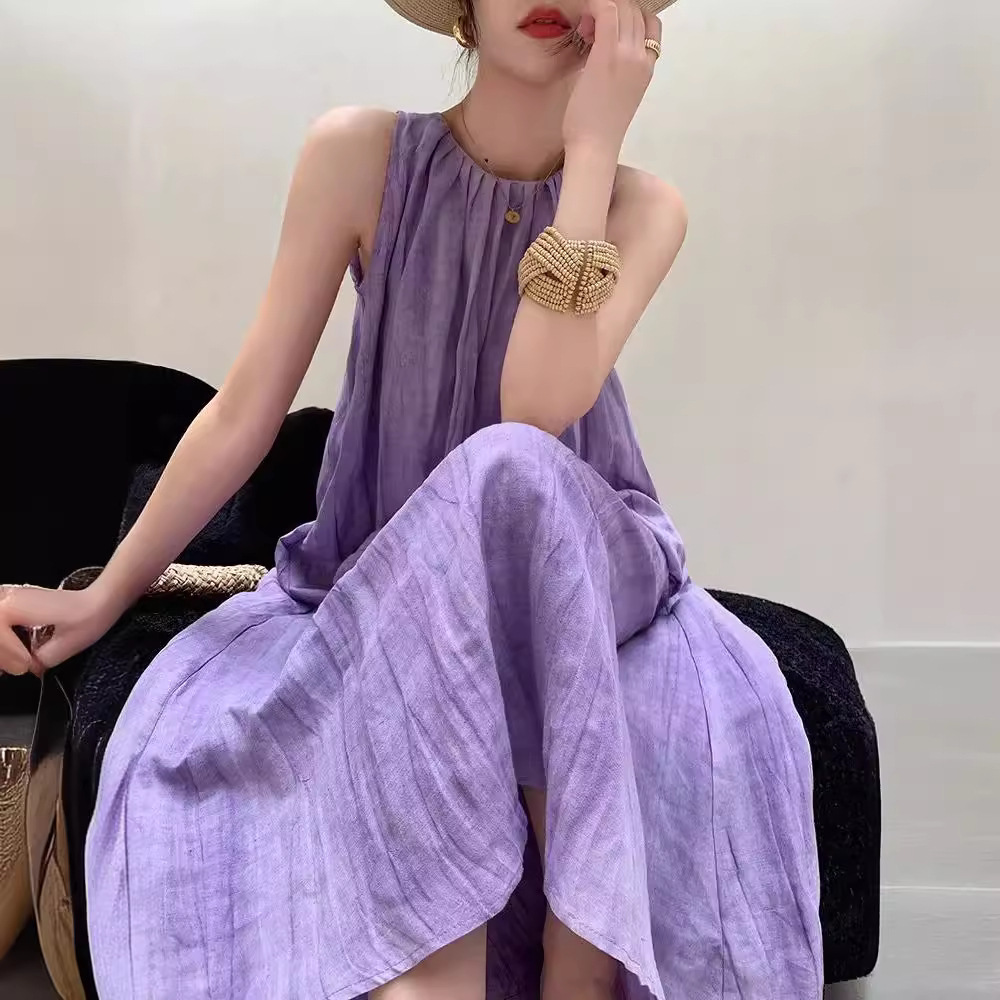 法式紫色无袖连衣裙女夏季新款慵懒风宽松气质度假裙