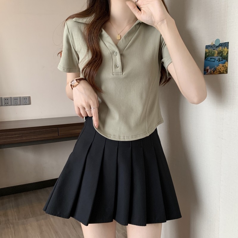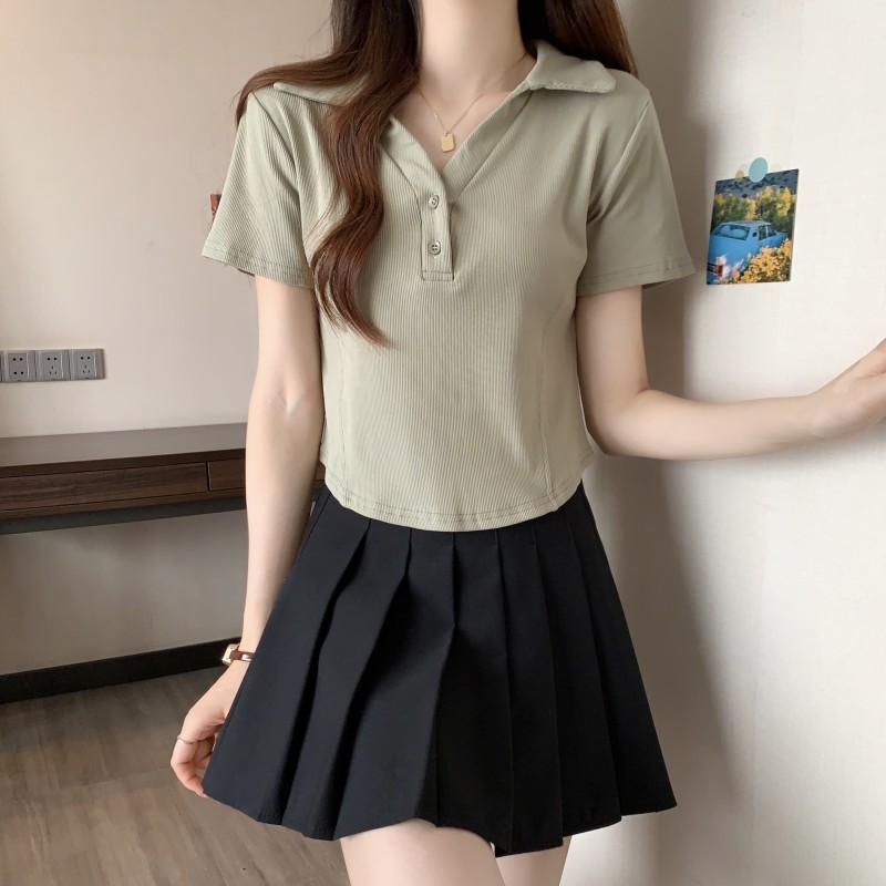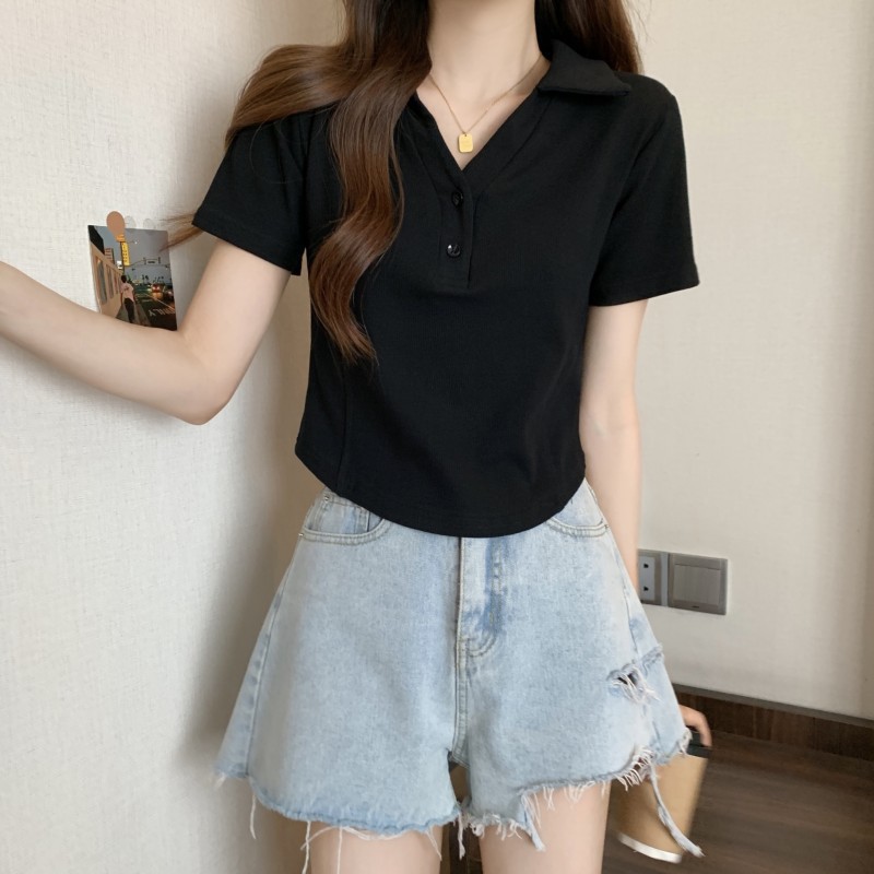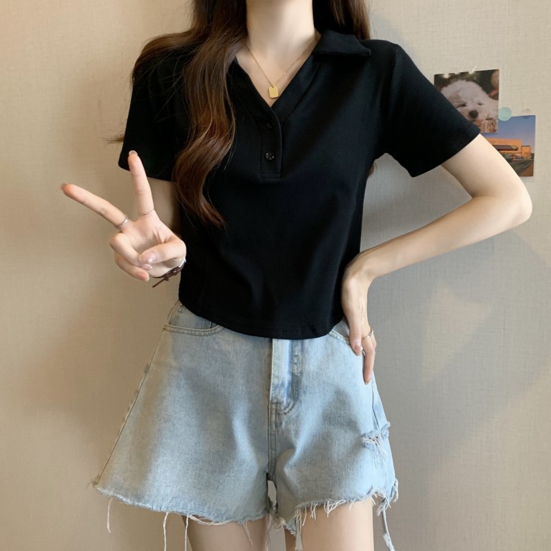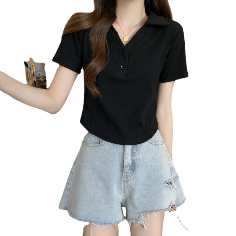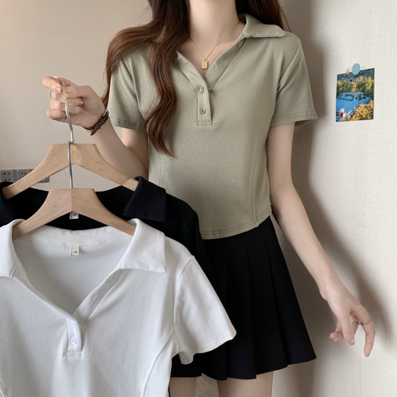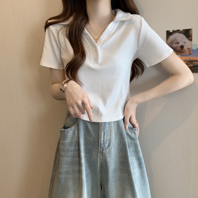 polo领白色短袖t恤女装夏季法式小众独特别致正肩短款绝美小上衣