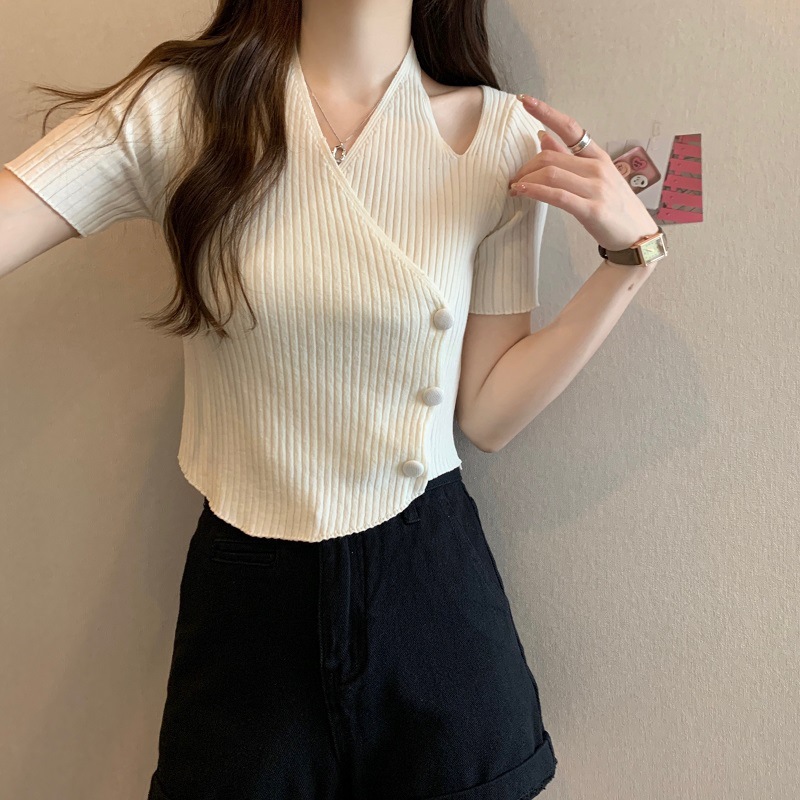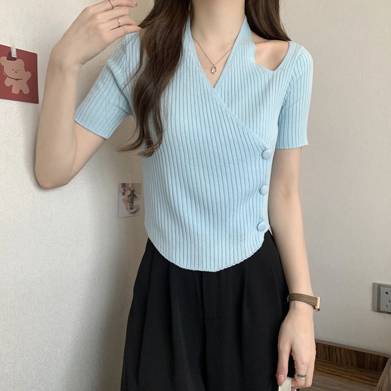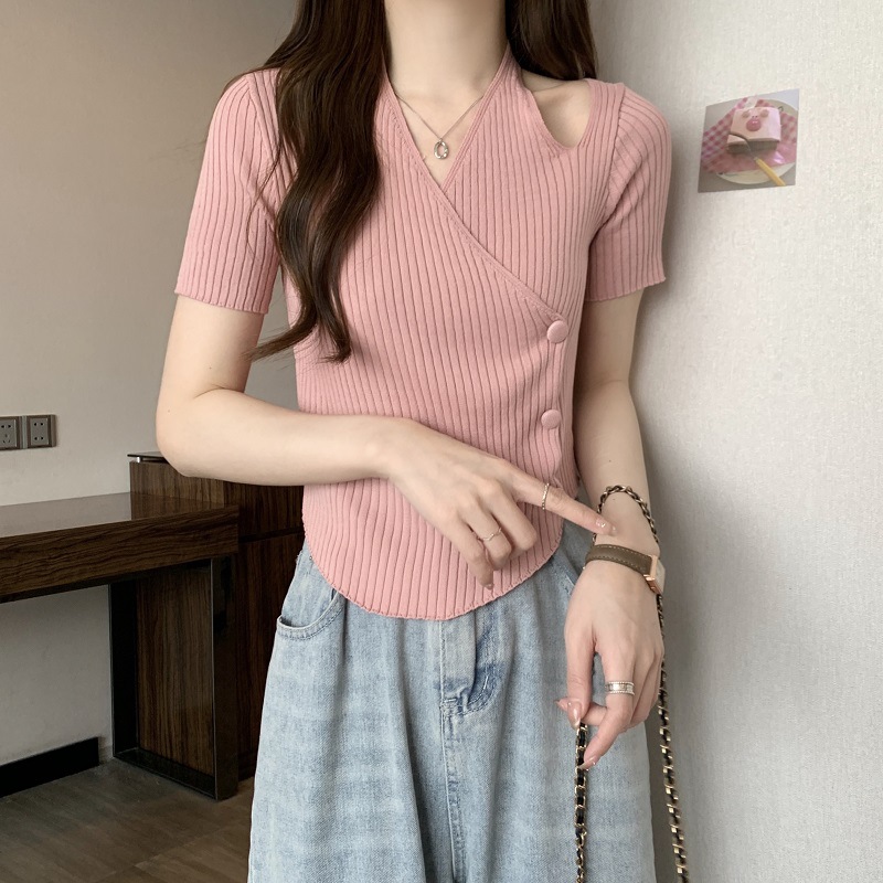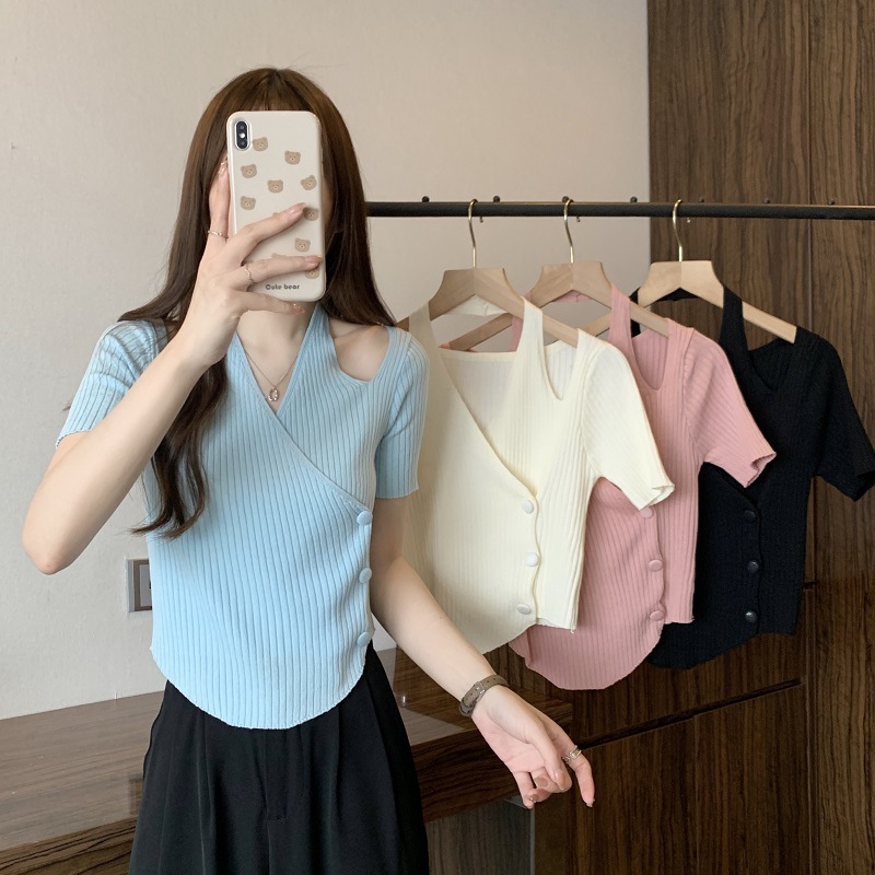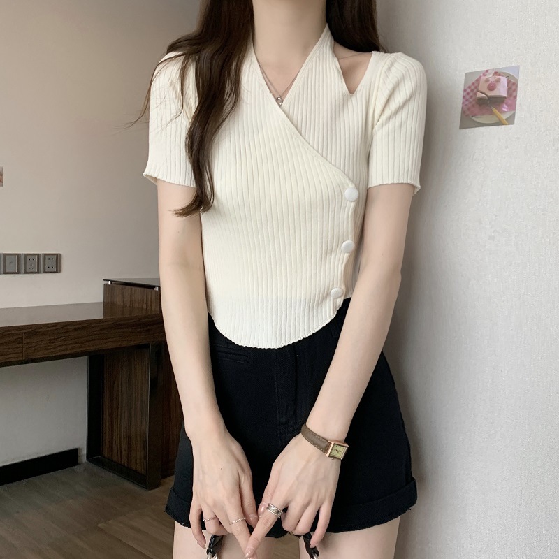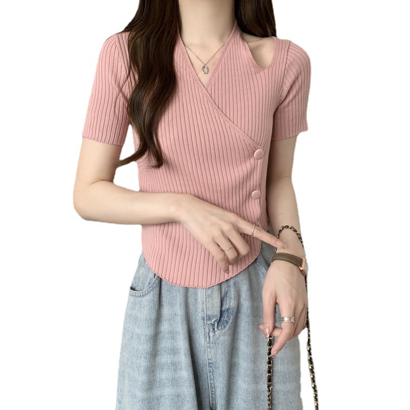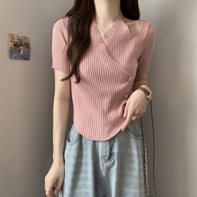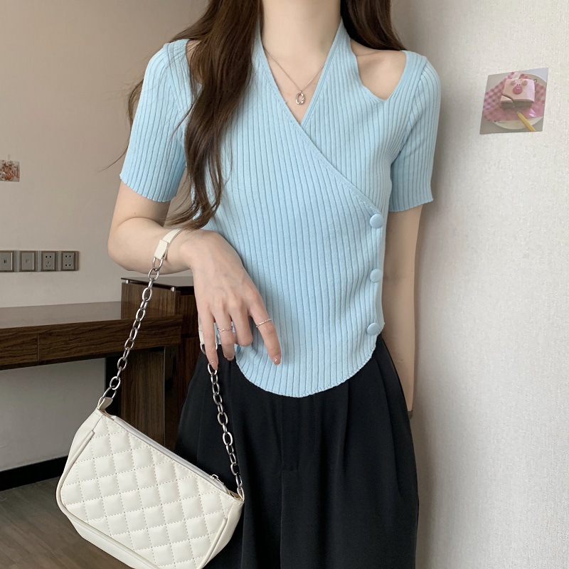 大码女装欲风挂脖短袖T恤不规则设计感针织上衣女装