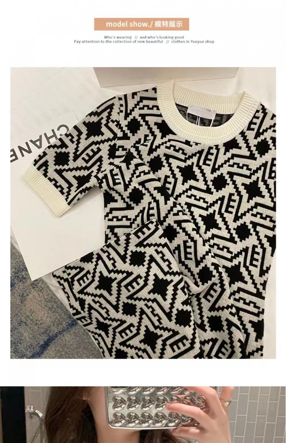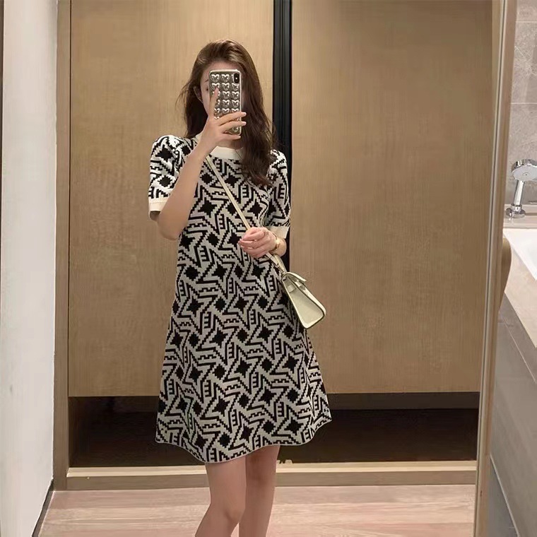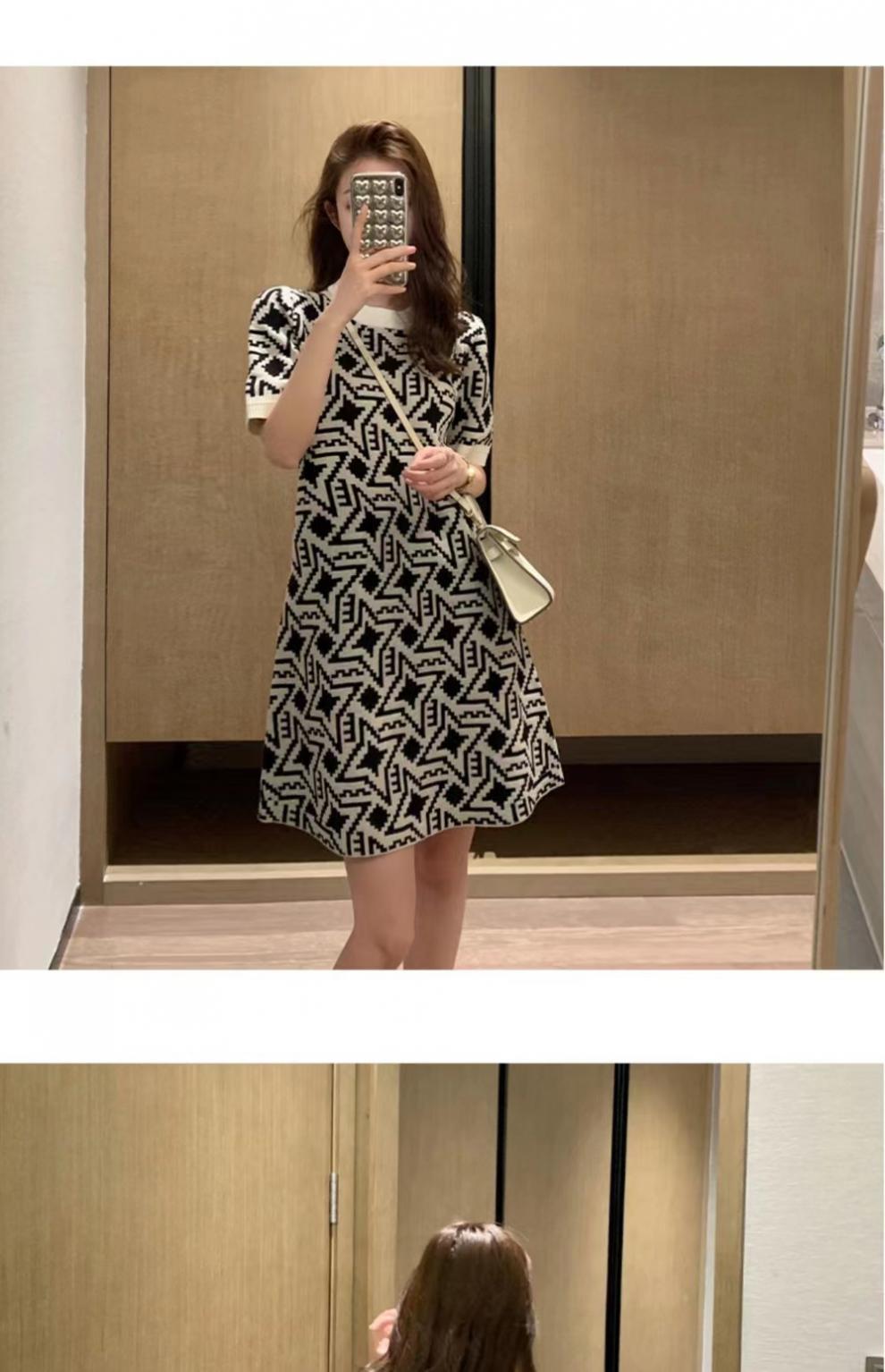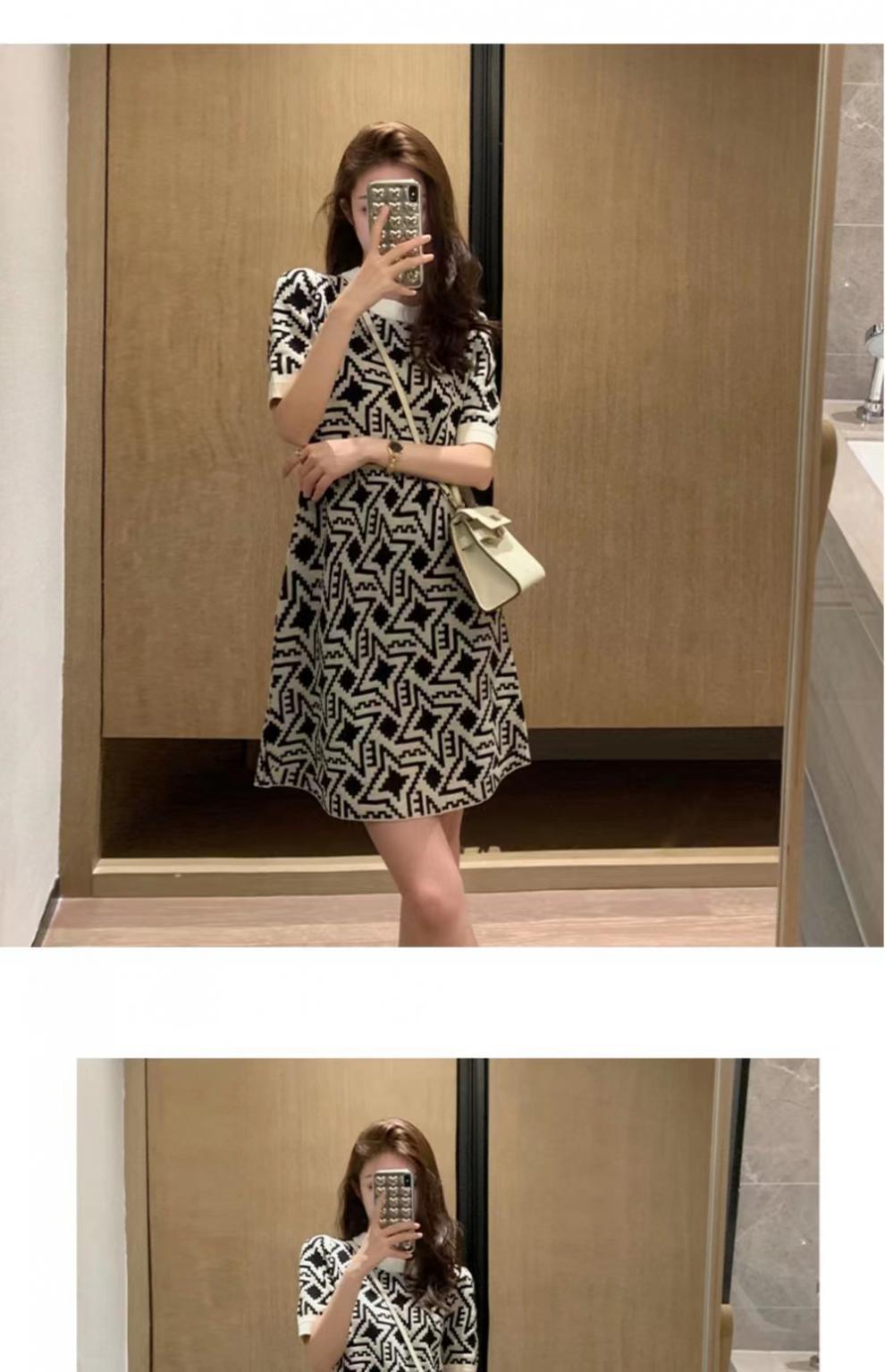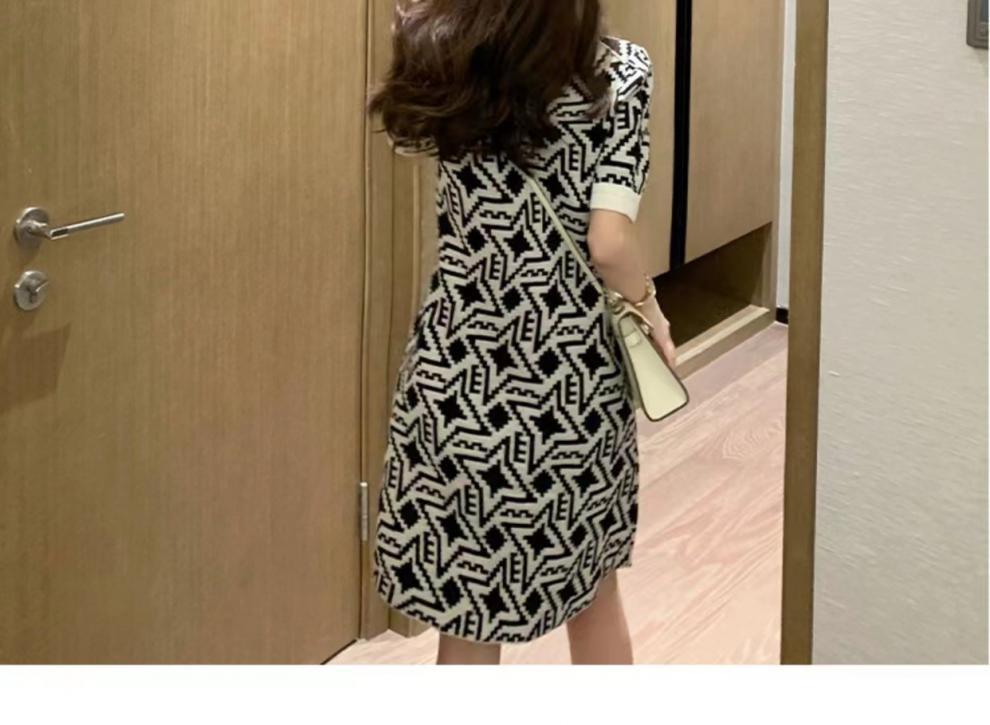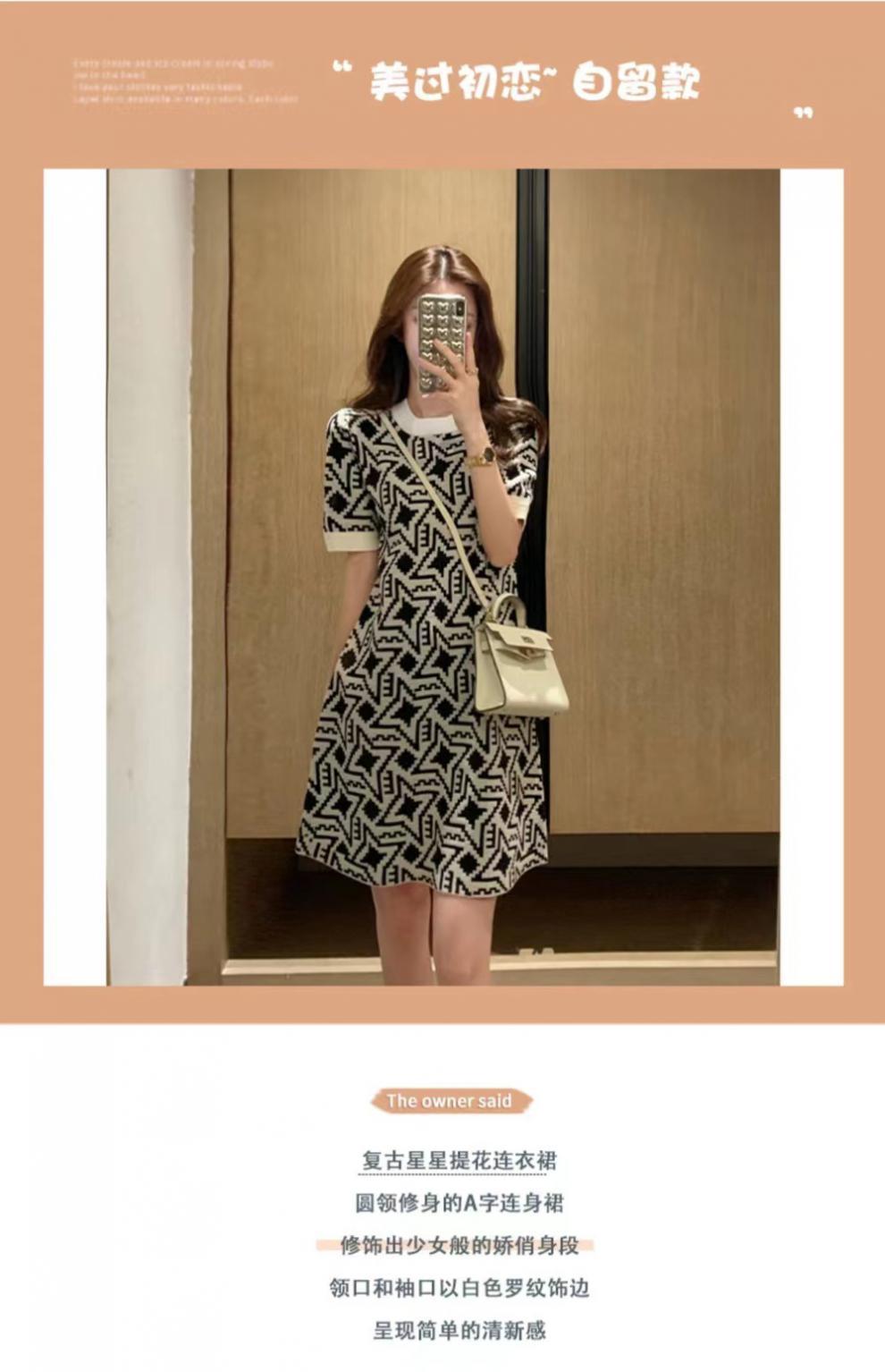 新款夏季赫本风复古时尚气质女神范黑白星星提花针织连衣裙女