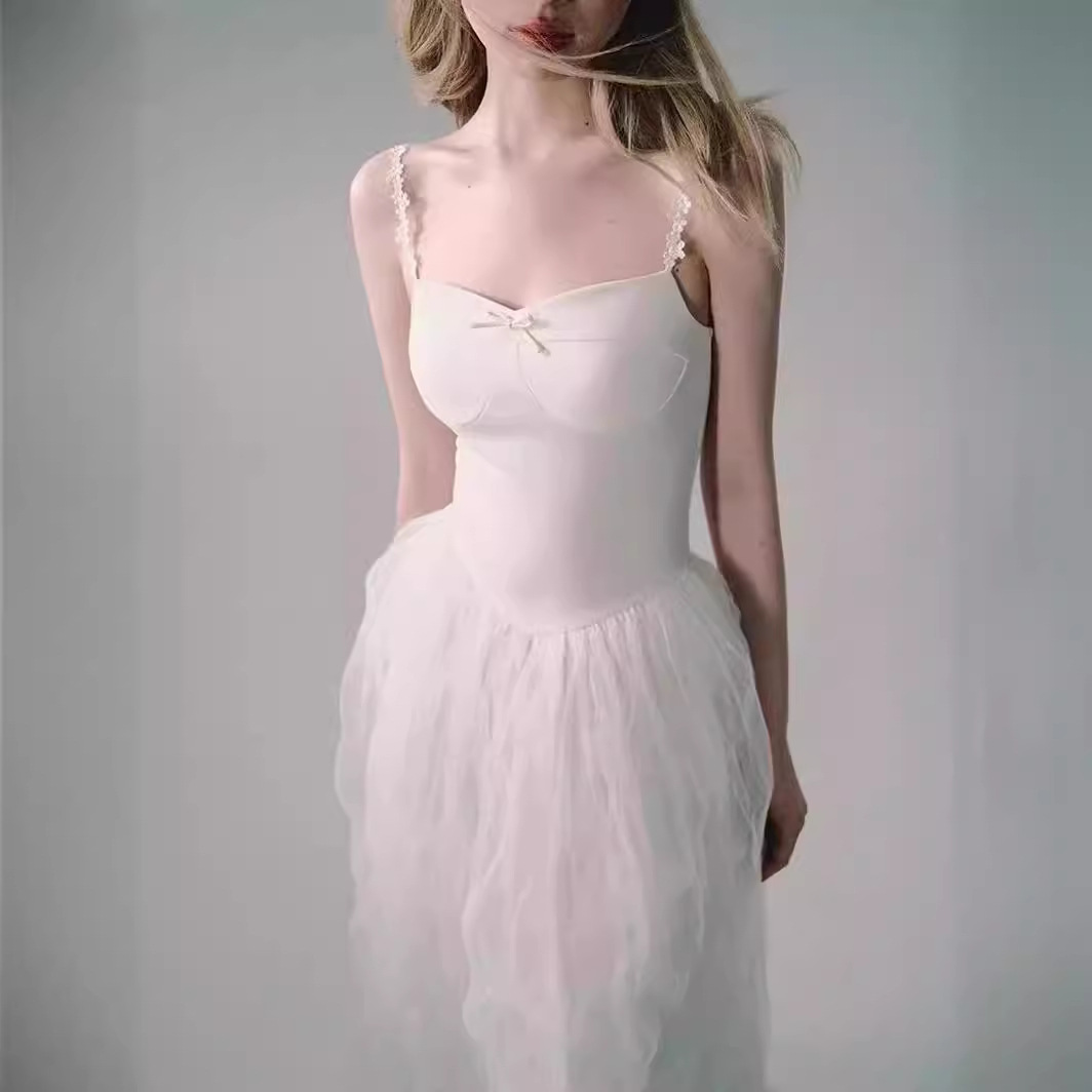 白吊带连衣裙网纱长裙女春季收腰显瘦刺绣裙子