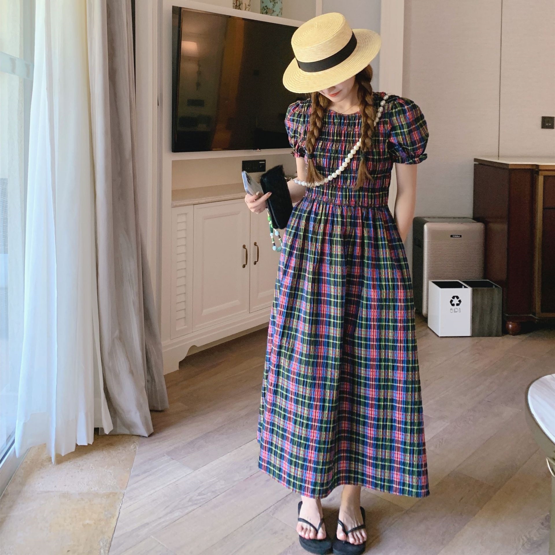 实拍抽褶打揽小圆领泡泡袖法式复古拼色格纹高腰显瘦大裙摆连衣裙