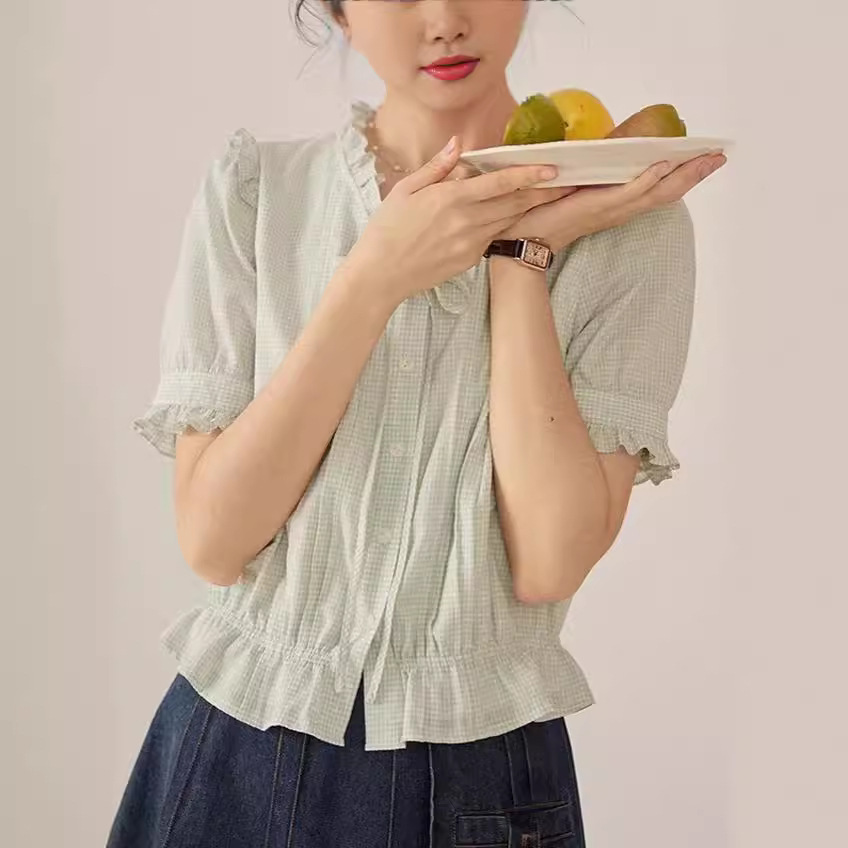 淡绿色格子系带短袖衬衫女夏季法式复古v领收腰上衣