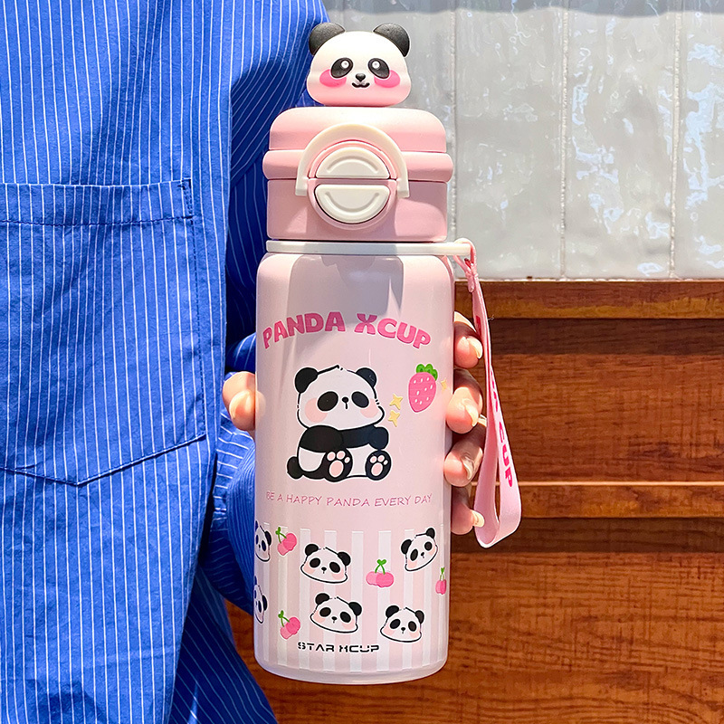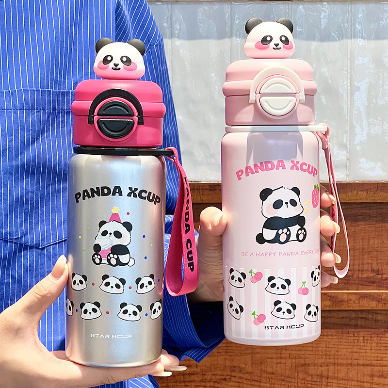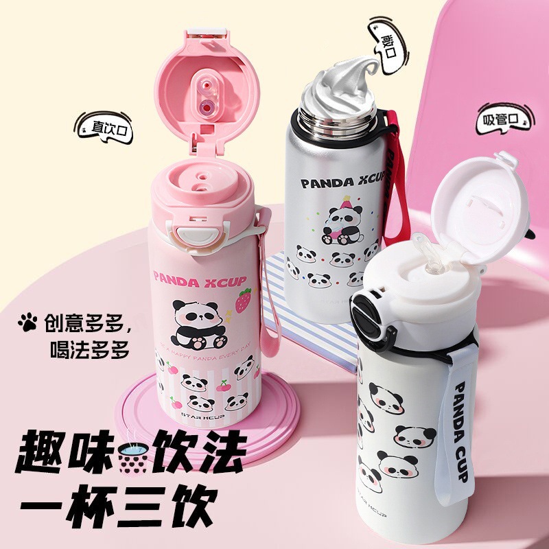 胖达熊猫儿童水杯上学专用新款男女孩高颜值双饮吸管保温杯子