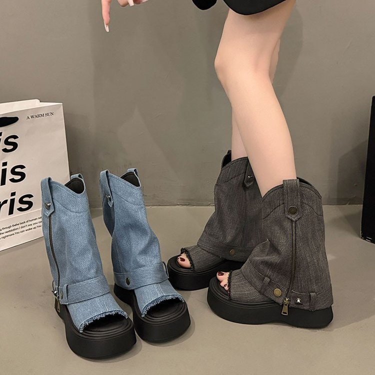 厚底凉鞋女款夏季2025新款复古堆堆裤管靴小众牛仔布短筒罗马凉靴