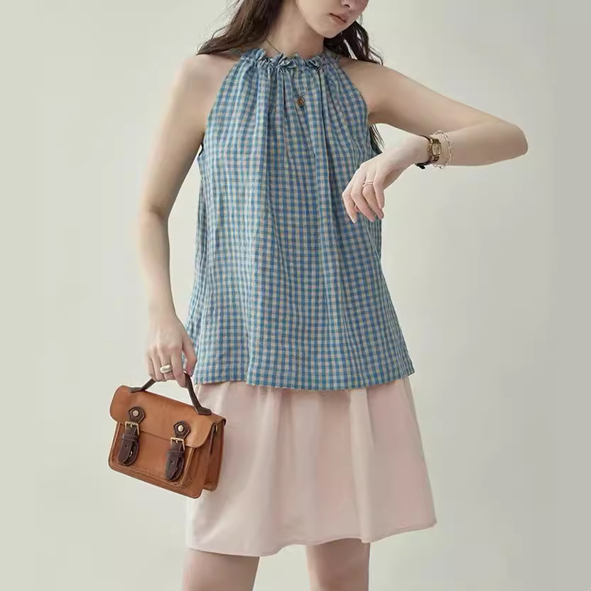 北岛超爽透气复古格子抽绳无袖背心衬衫女夏季上衣