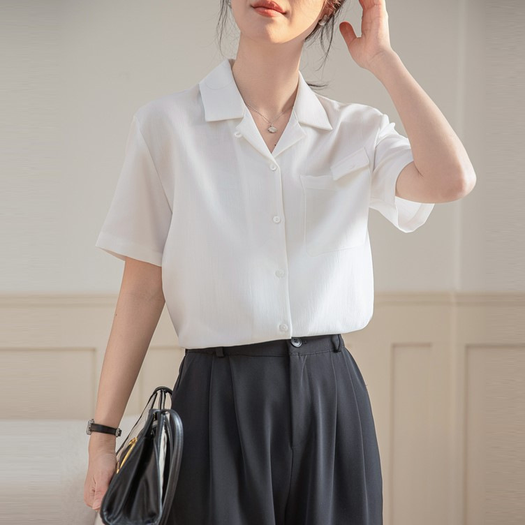 白色小袋盖设计感短袖衬衫女2025夏季职业通勤休闲别致衬衣上衣