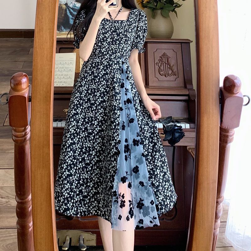 大码女装复古方领泡泡袖碎花连衣裙夏季胖mm复古网纱拼接气质裙子