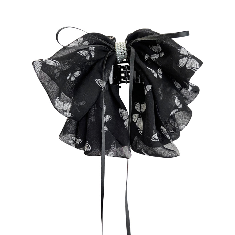蝴蝶印花黑色雪纺抓夹气质马尾抓夹后脑勺显脸小夹子外出百搭头饰