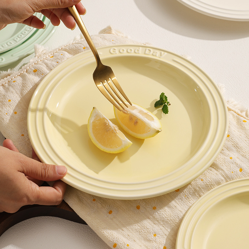 纯色陶瓷盘子ins奶油色釉下彩浮雕字母餐盘 家用西餐意面盘甜品盘