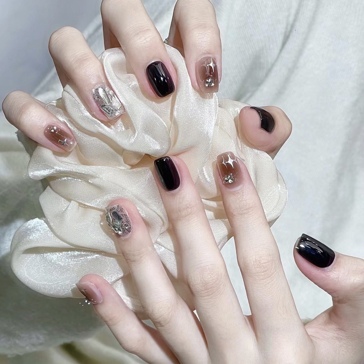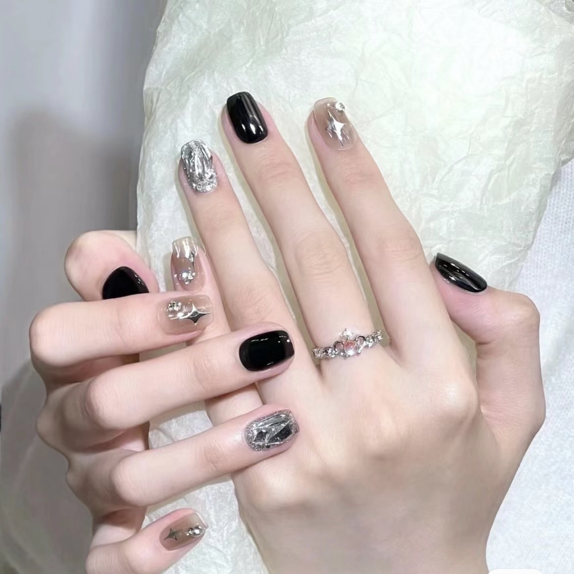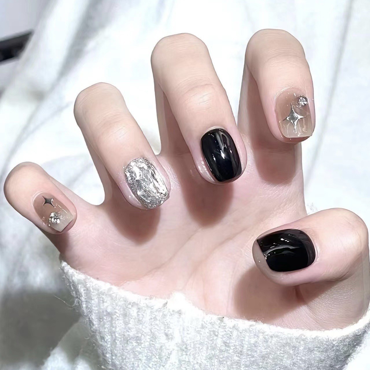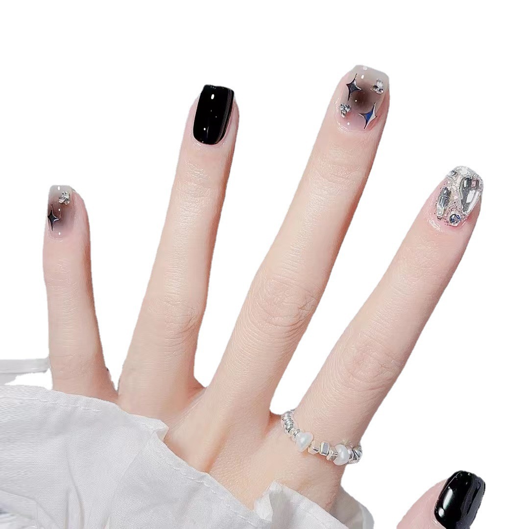 时尚经典纯欲风黑银跳色满钻星星穿戴甲无痕软甲美甲贴片