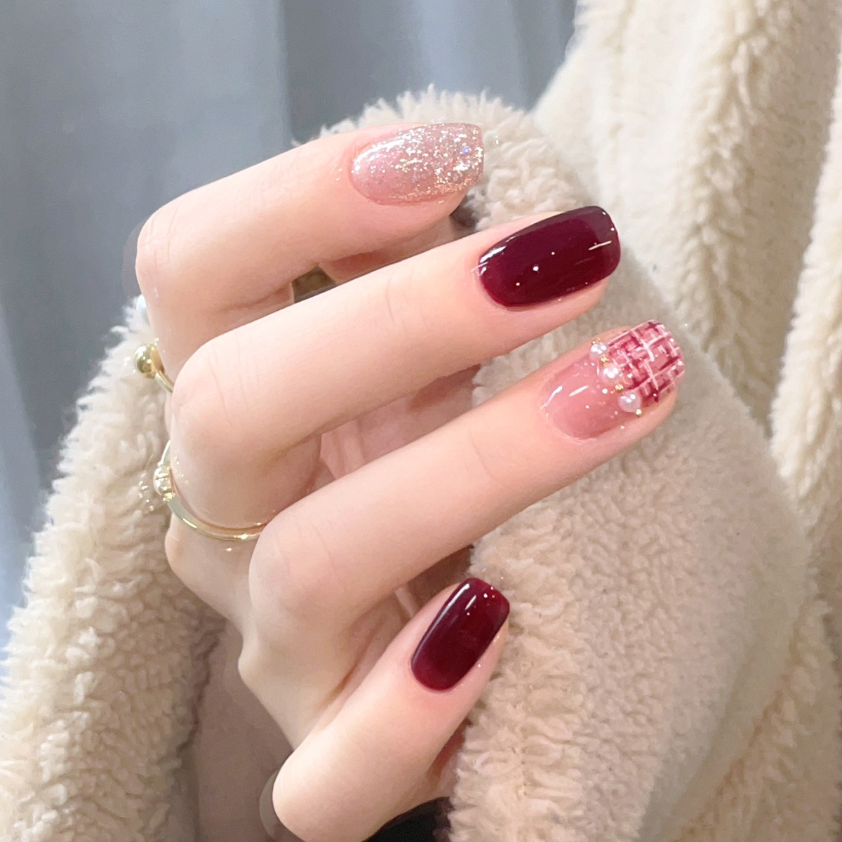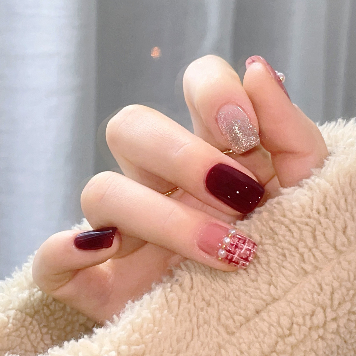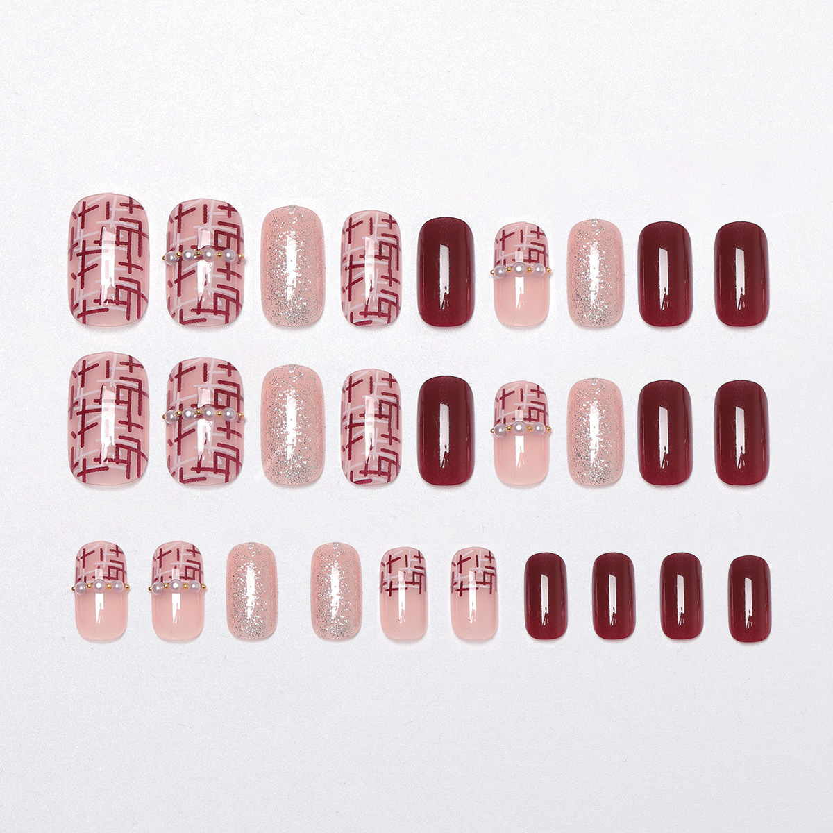 酒红格纹镶钻 穿戴式美甲贴美甲片显白指甲贴片可拆卸假指甲成品