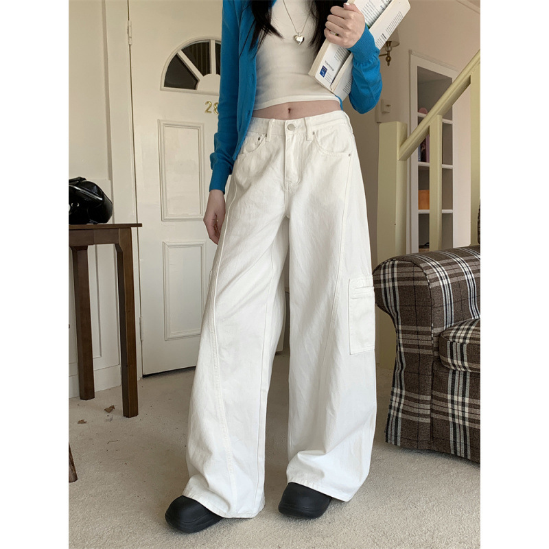 早春美式阔腿工装牛仔裤女新款高腰显瘦直筒拖地长裤女