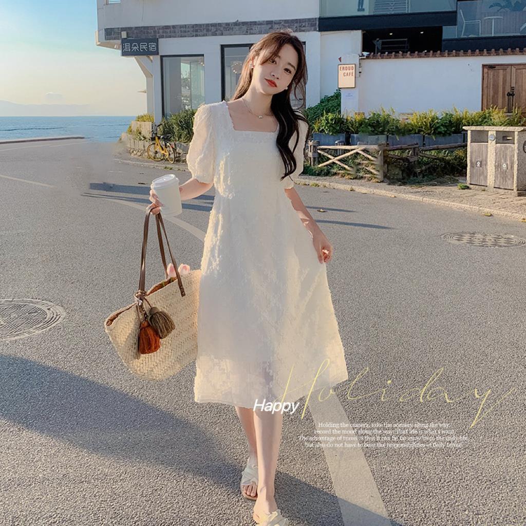 白色方领海边度假连衣裙女夏新款法式温柔风漂亮别致泡泡袖裙