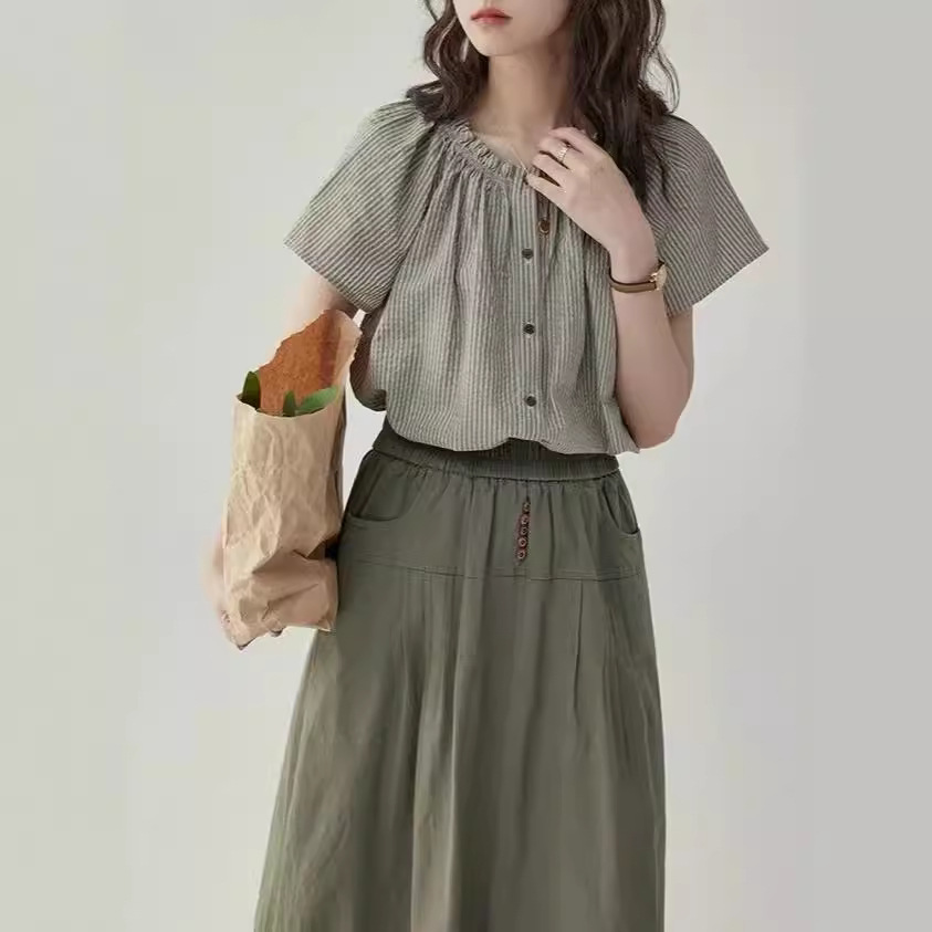 法式复古压褶花边圆领衬衫女新款夏季娃娃衫显瘦减龄衬衣