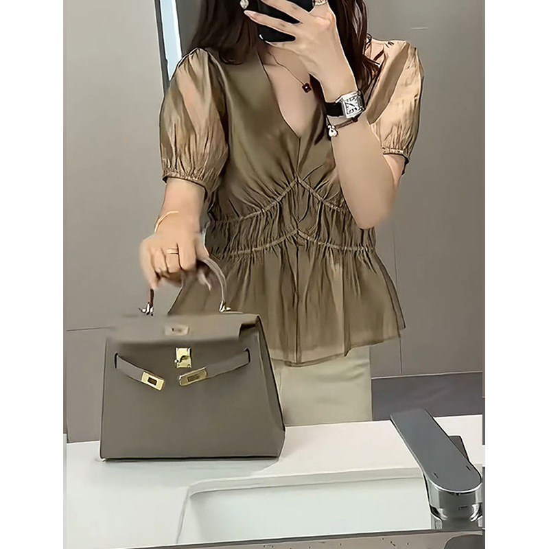 大码微胖雪纺v领短袖衬衫夏季新款今年流行法式收腰显瘦上衣
