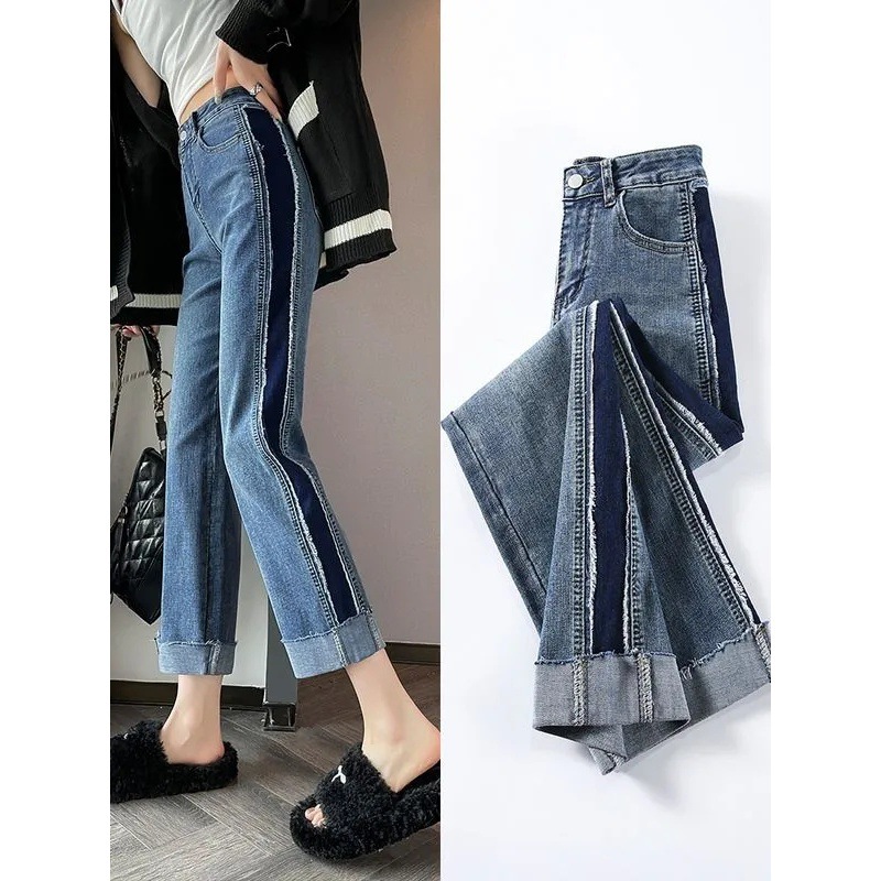 新款牛仔裤女撞色阔腿夏季梨型身材高腰宽松小个子九分烟管裤