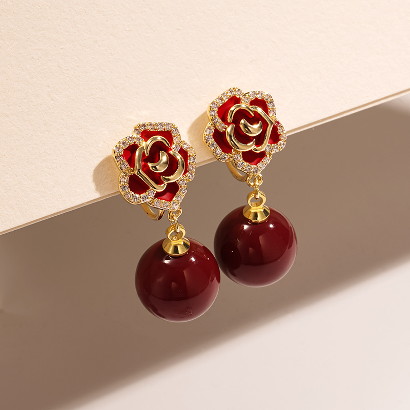 秋冬新款红色山茶花珍珠耳坠耳环女无耳洞蚊香盘耳夹气质高级耳饰