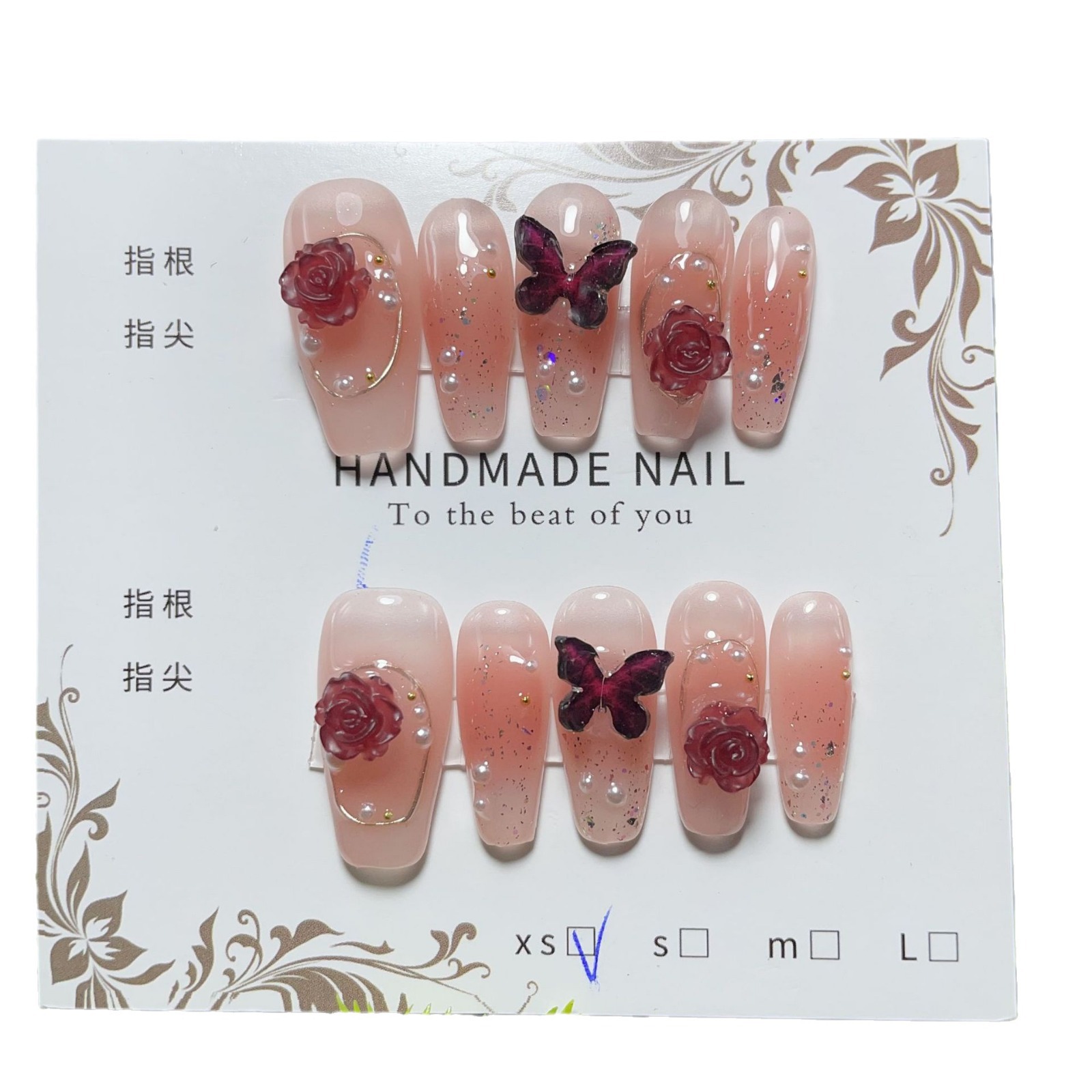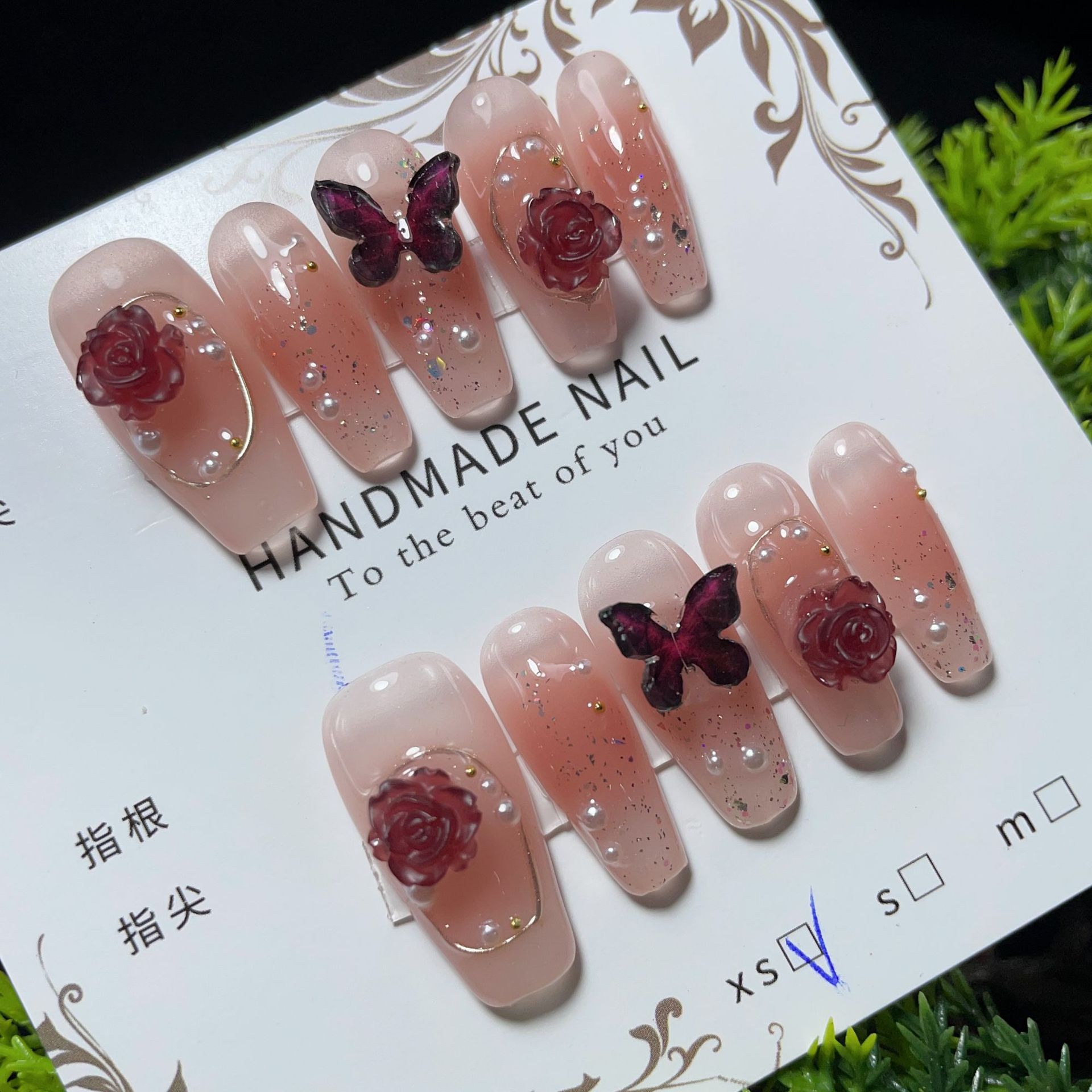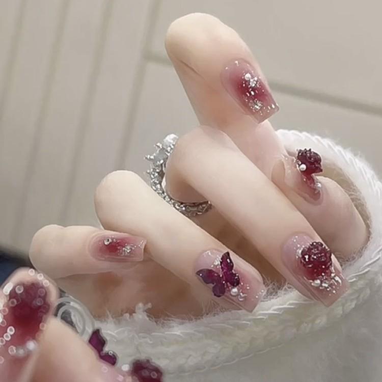 手工穿戴甲乌梅子酱辣妹酒红山茶花蝴蝶假指甲手工穿戴甲贴片