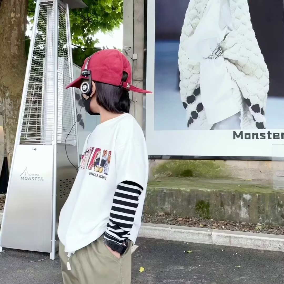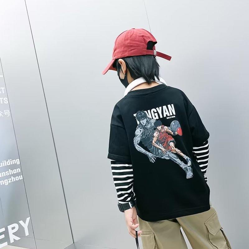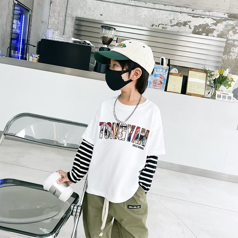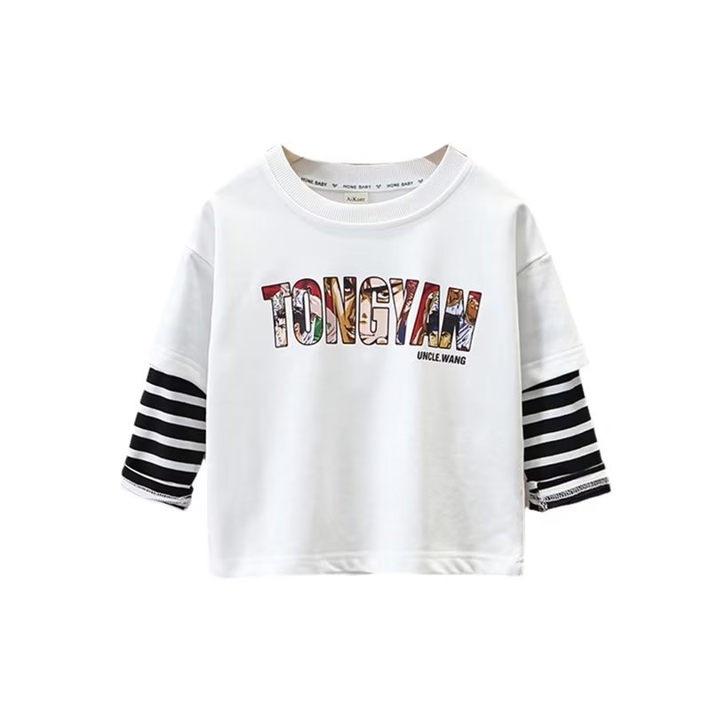 春新款男童假两件卫衣儿童装帅气条纹T恤时尚卡通打底衫跨境
