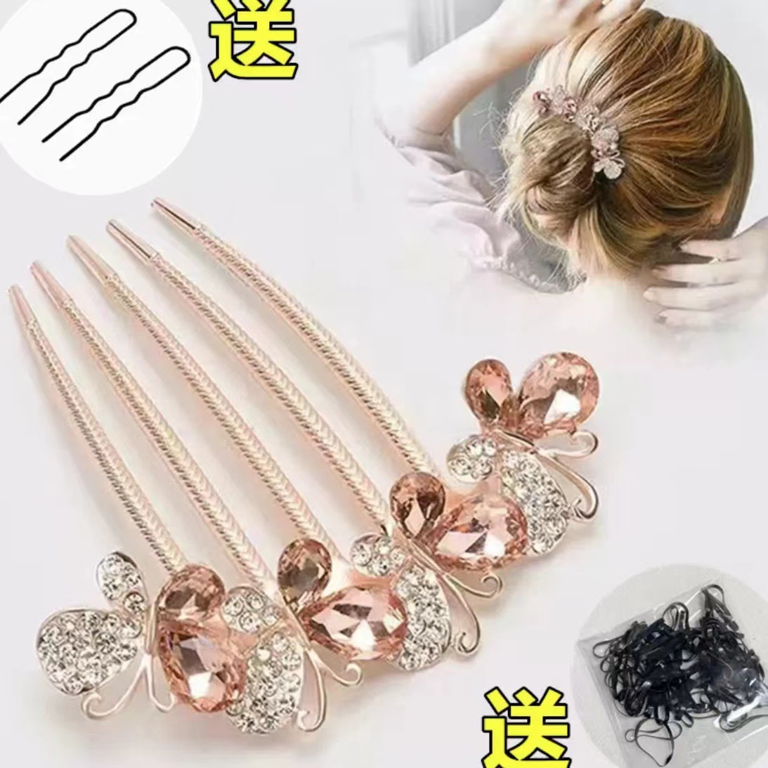 水钻蝴蝶发梳金属五齿防滑插梳后脑勺盘发发饰+2U+500根小皮筋