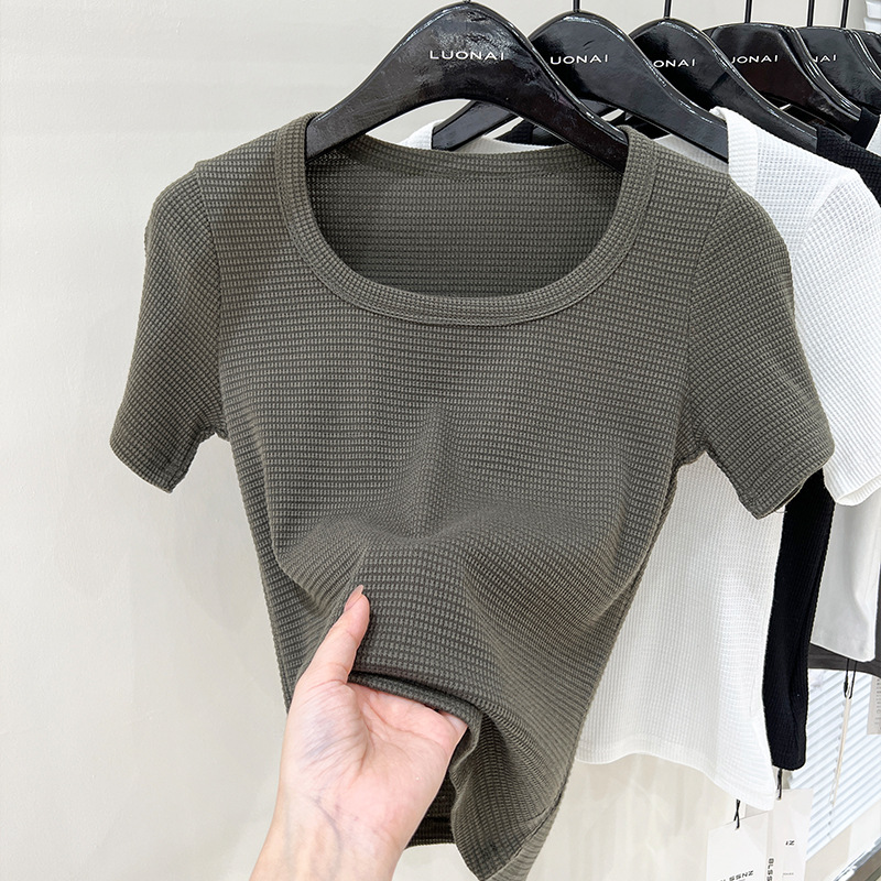 短袖t恤女新款华夫格小衫女锁骨方领上衣女潮