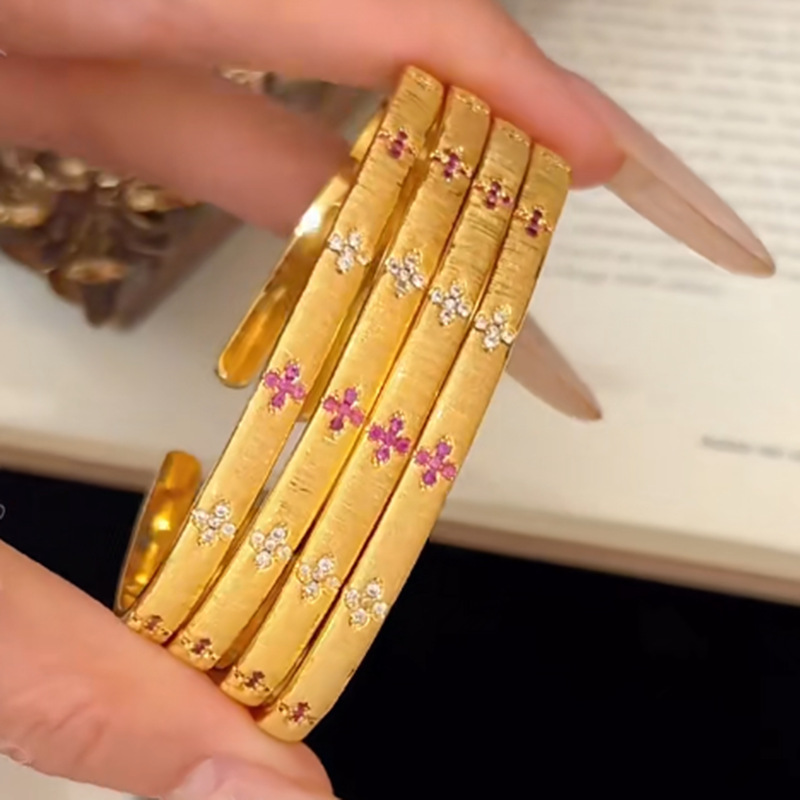 小红书爆款拉丝四叶草闪钻手镯时尚轻奢粉白钻开口手环