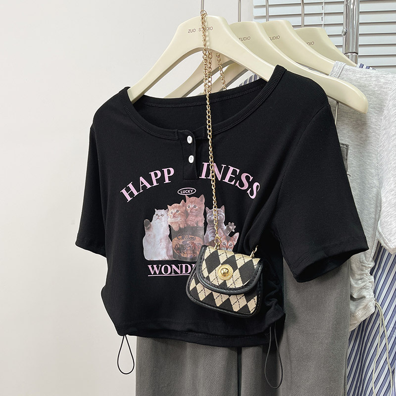 正肩短袖T恤女夏季设计感小众美式印花甜辣短款修身上衣服
