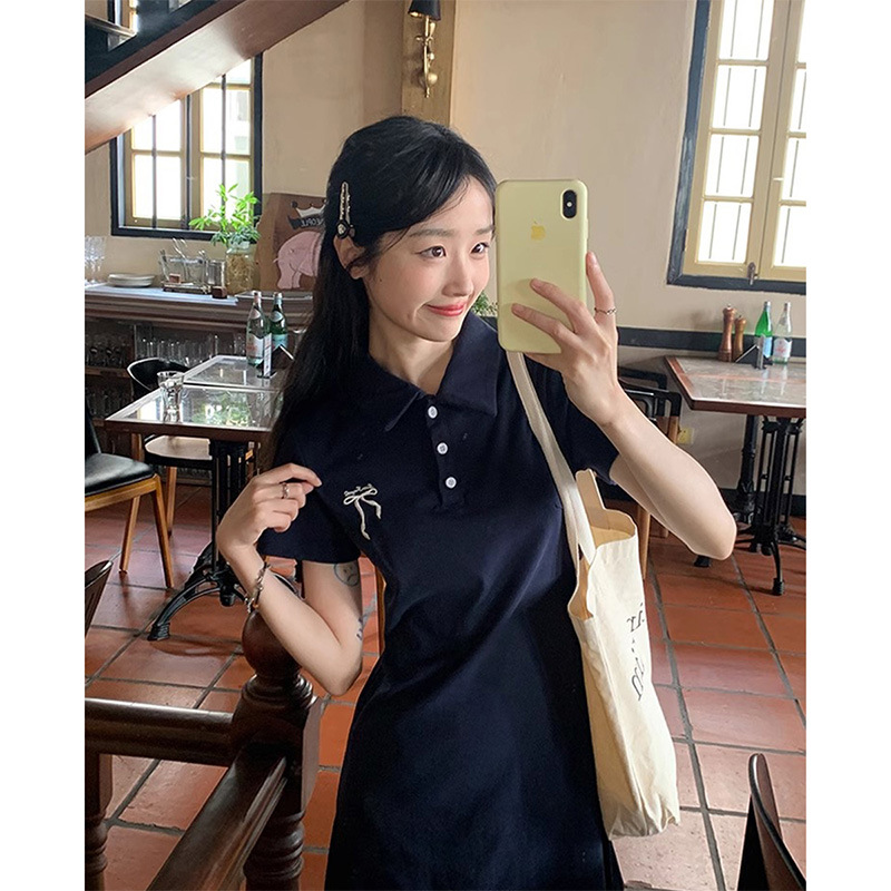 纯棉蝴蝶结polo领短袖连衣裙女夏季时尚气质收腰高级感包臀短裙子