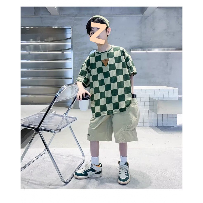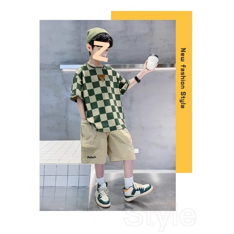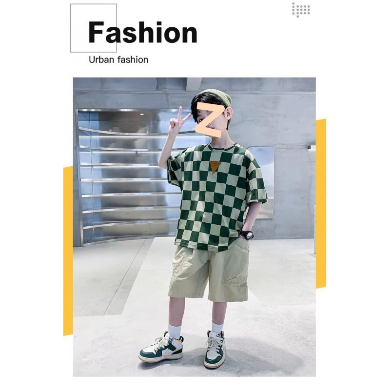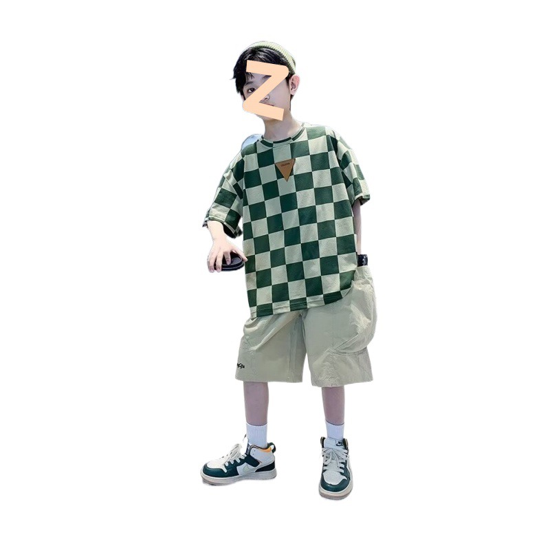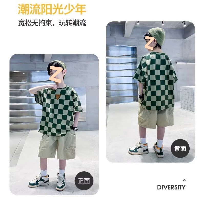 跨境男童夏季短袖新款大儿童洋气运动休闲格子满印短袖T恤潮