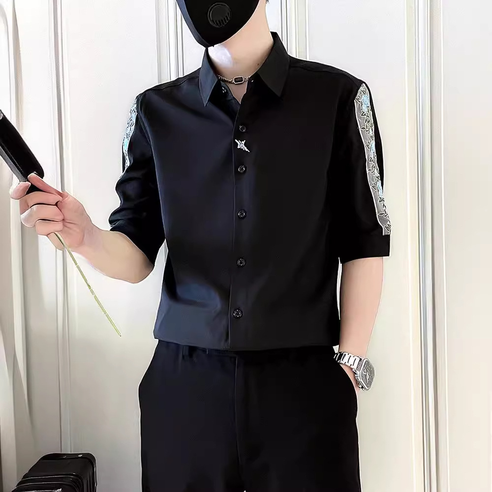 黑色衬衫短袖男夏季潮牌修身痞帅刺绣衬衣新款男士五分袖寸衫
