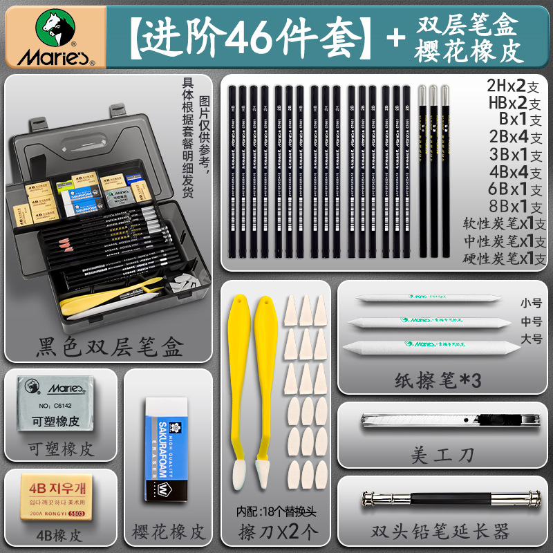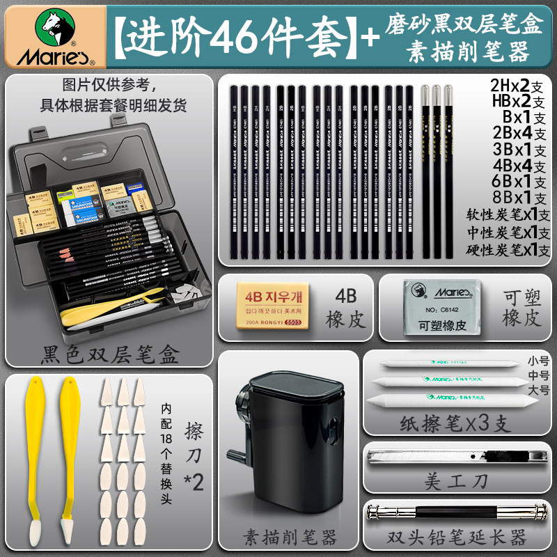 - 【马利素描纸+进阶46件】黑色双层笔盒