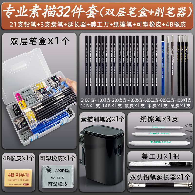 - 马利铅笔素描34件套-手摇画架-4K实心画板