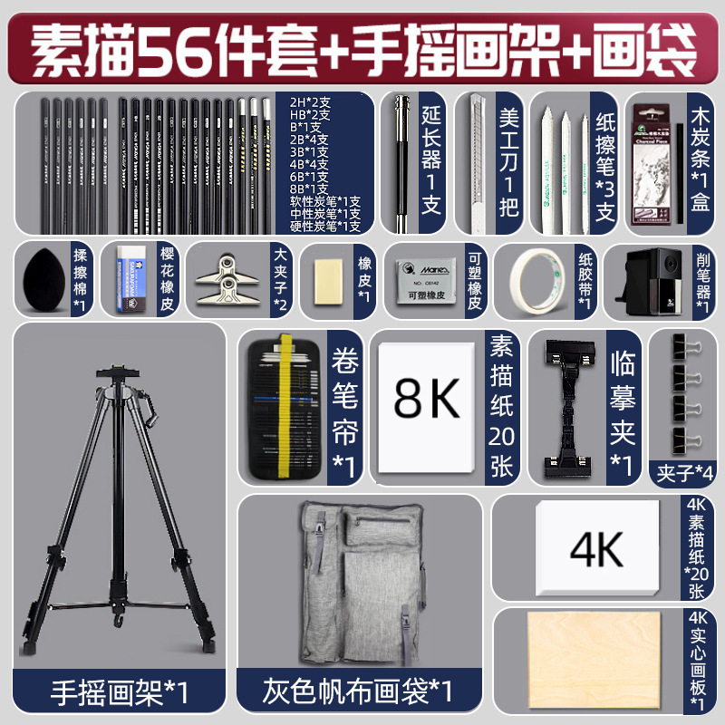 - 马利铅笔素描56件套-木质画架-实心画板-削笔机- 灰色帆布画袋