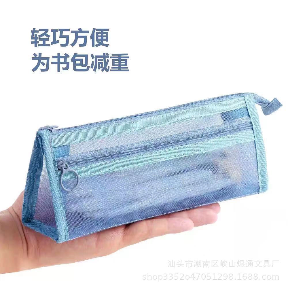 网纱袋莫兰迪笔袋简约透明网纱双层大容量学生考试拉链文具收纳袋