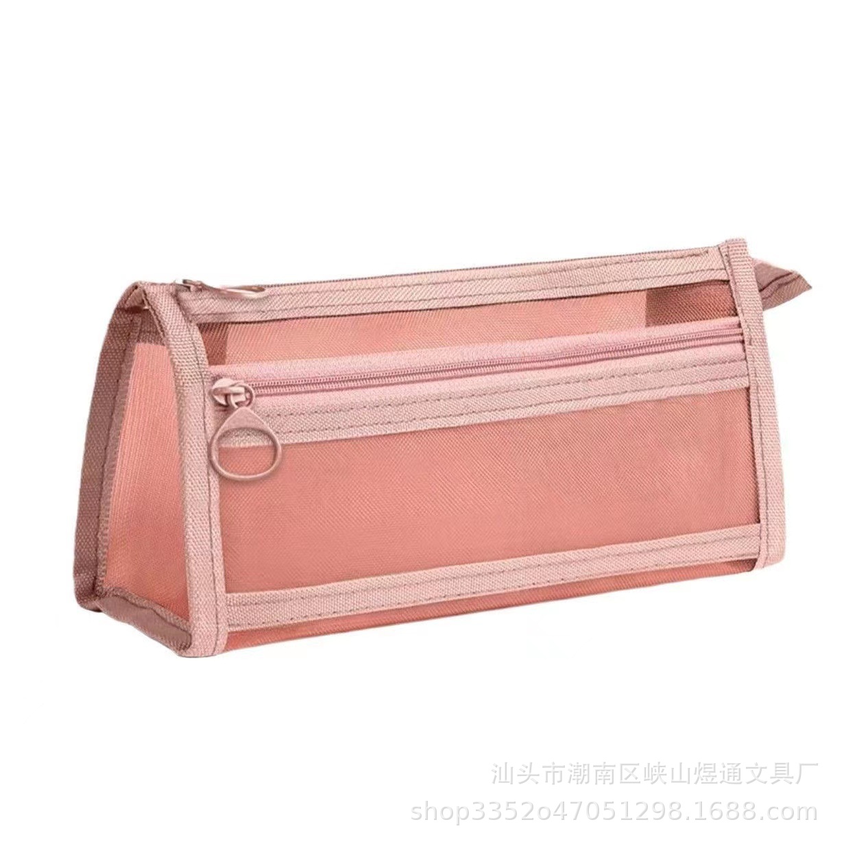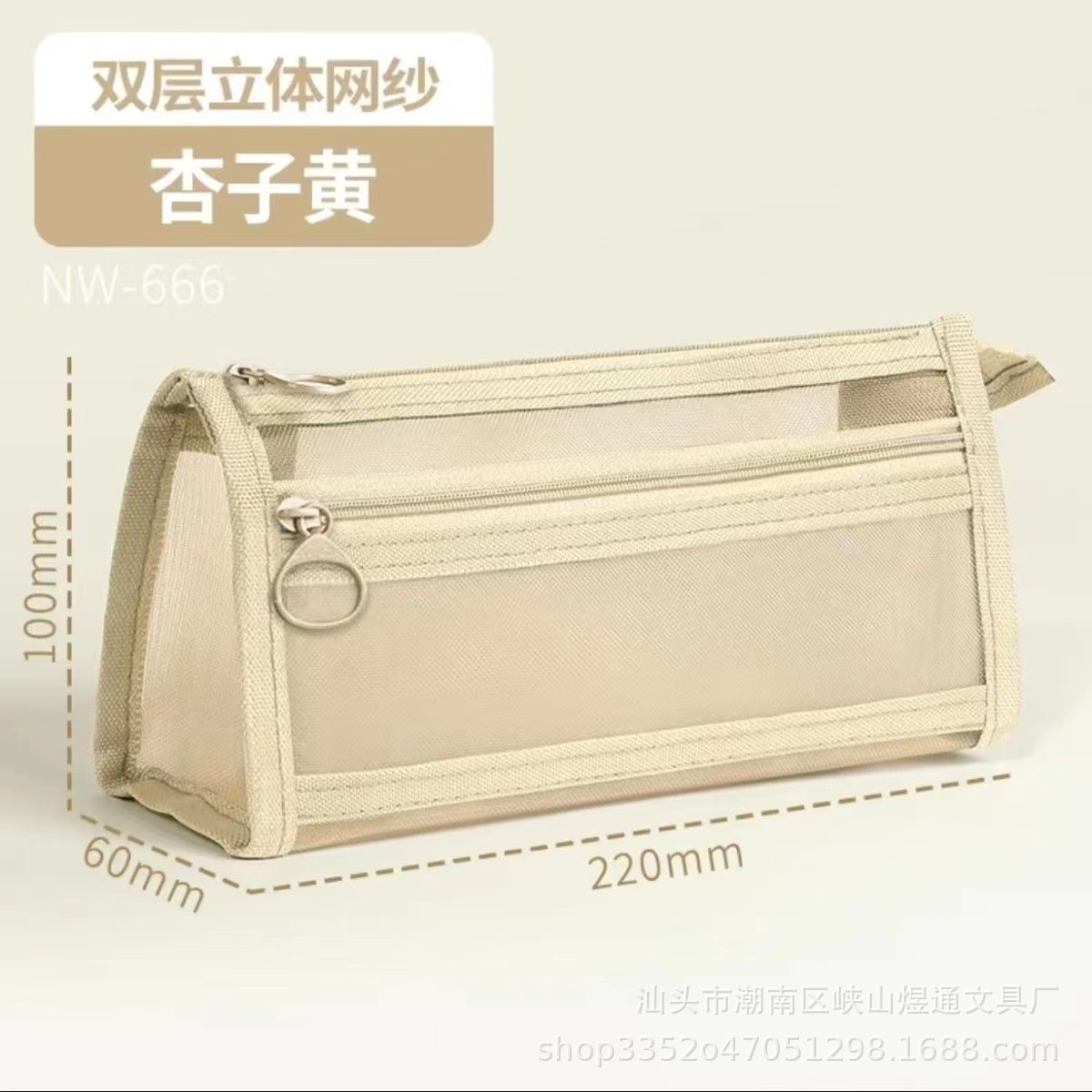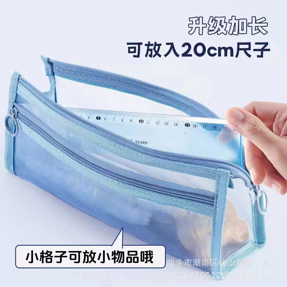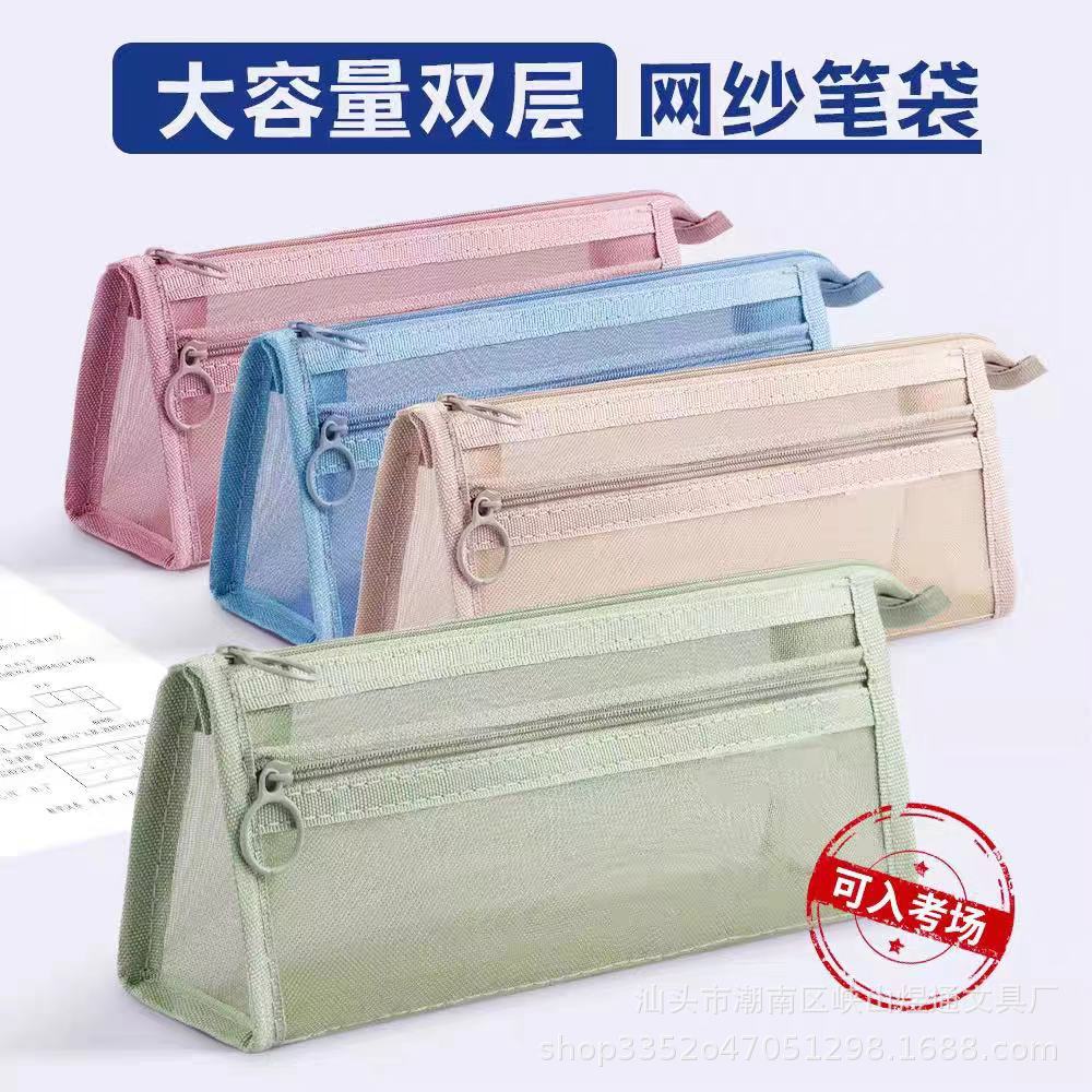网纱袋莫兰迪笔袋简约透明网纱双层大容量学生考试拉链文具收纳袋