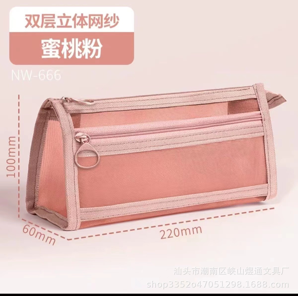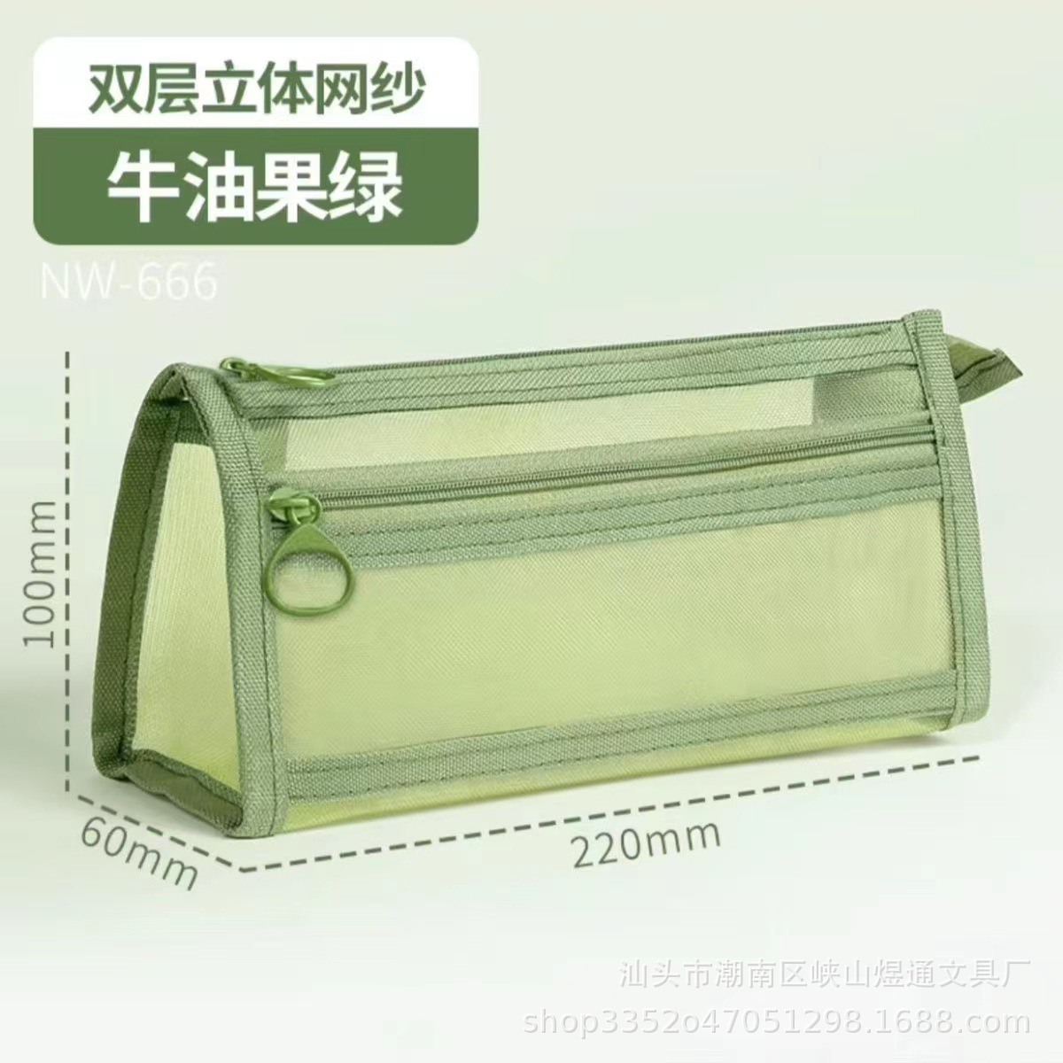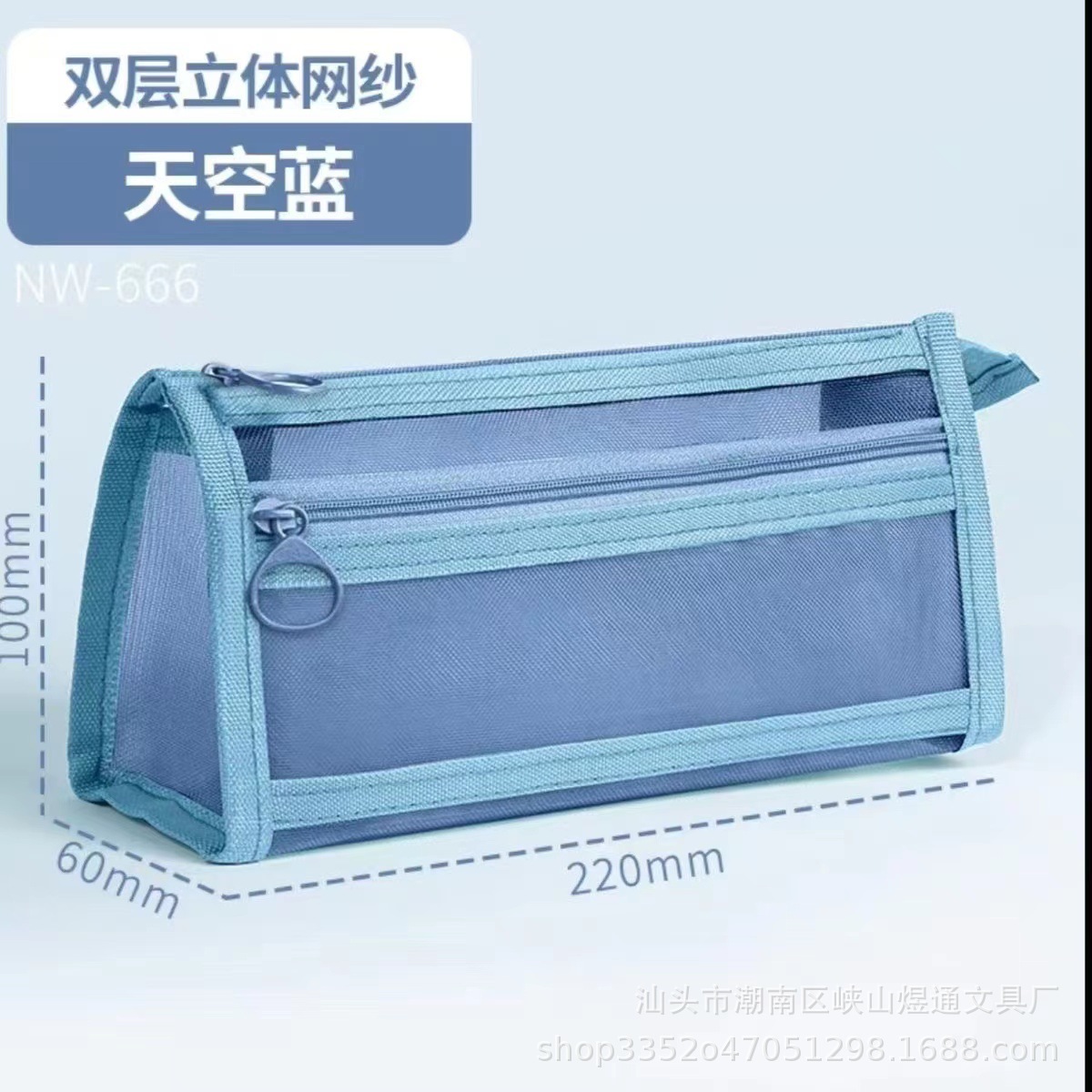 网纱袋莫兰迪笔袋简约透明网纱双层大容量学生考试拉链文具收纳袋