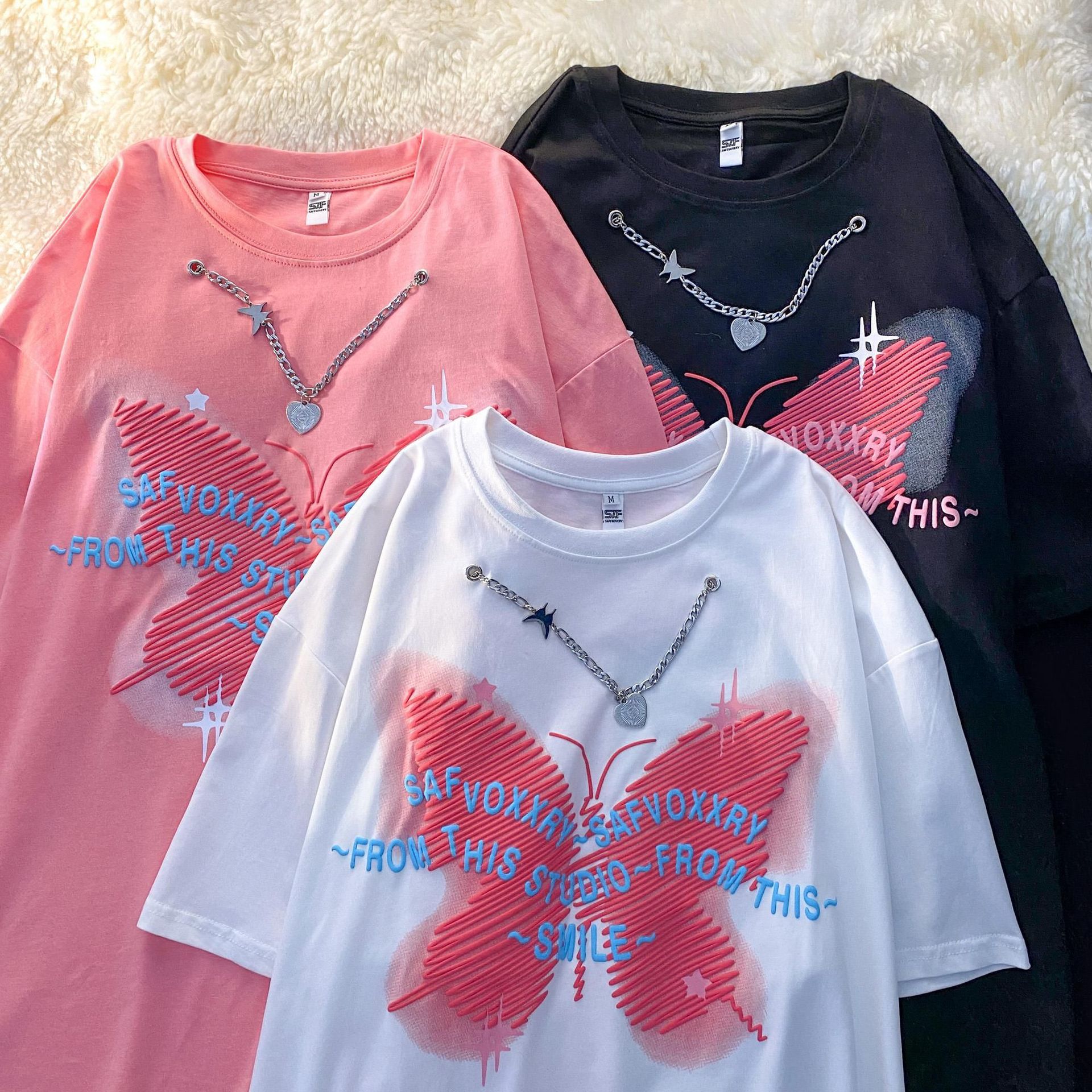 重磅纯棉甜酷蝴蝶结项链设计感短袖T恤女夏季百搭情侣上衣潮