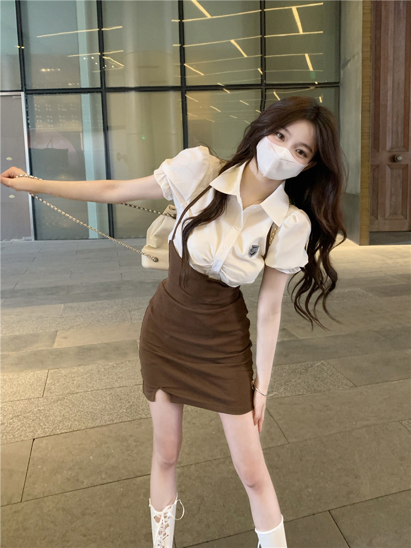 夏季学院风小个子背带裙收腰甜辣妹短裙别致裙子假两件连衣裙